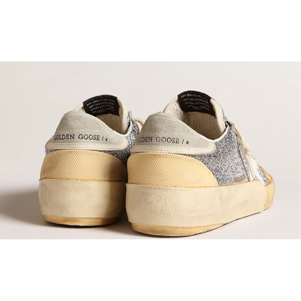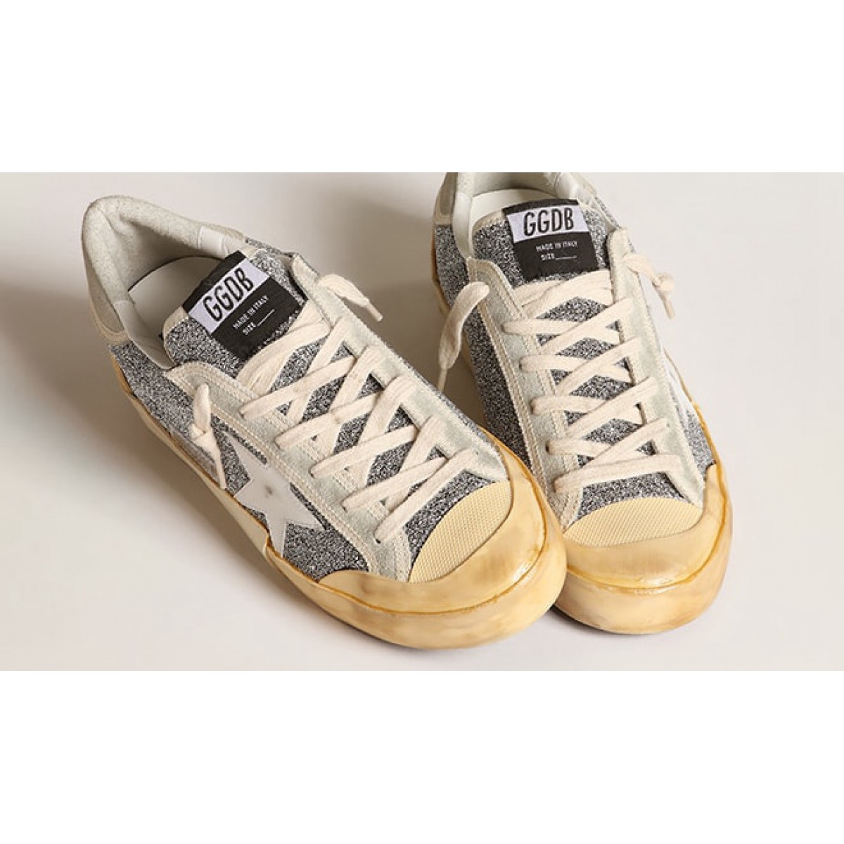 Eine zeitlose Ikone und eine und sich ständig weiterentwickelt. Bei Golden lieben wir es, unsere Klassiker zu nehmen und sie ständig zu überarbeiten, immer aus einem neuen Blickwinkel. Diese Frauenversion in limitierter Aufgabe verfügt über ein silberner Swarovski-Glitzer-Obermaterial mit einem weißen Lederstern und einer cremefarbenen Wildleder-Ferse. Die beige Gummi-Zehen und cremefarbene Schnürsenkel fügen einen stilvollen Schliff hinzu. li>