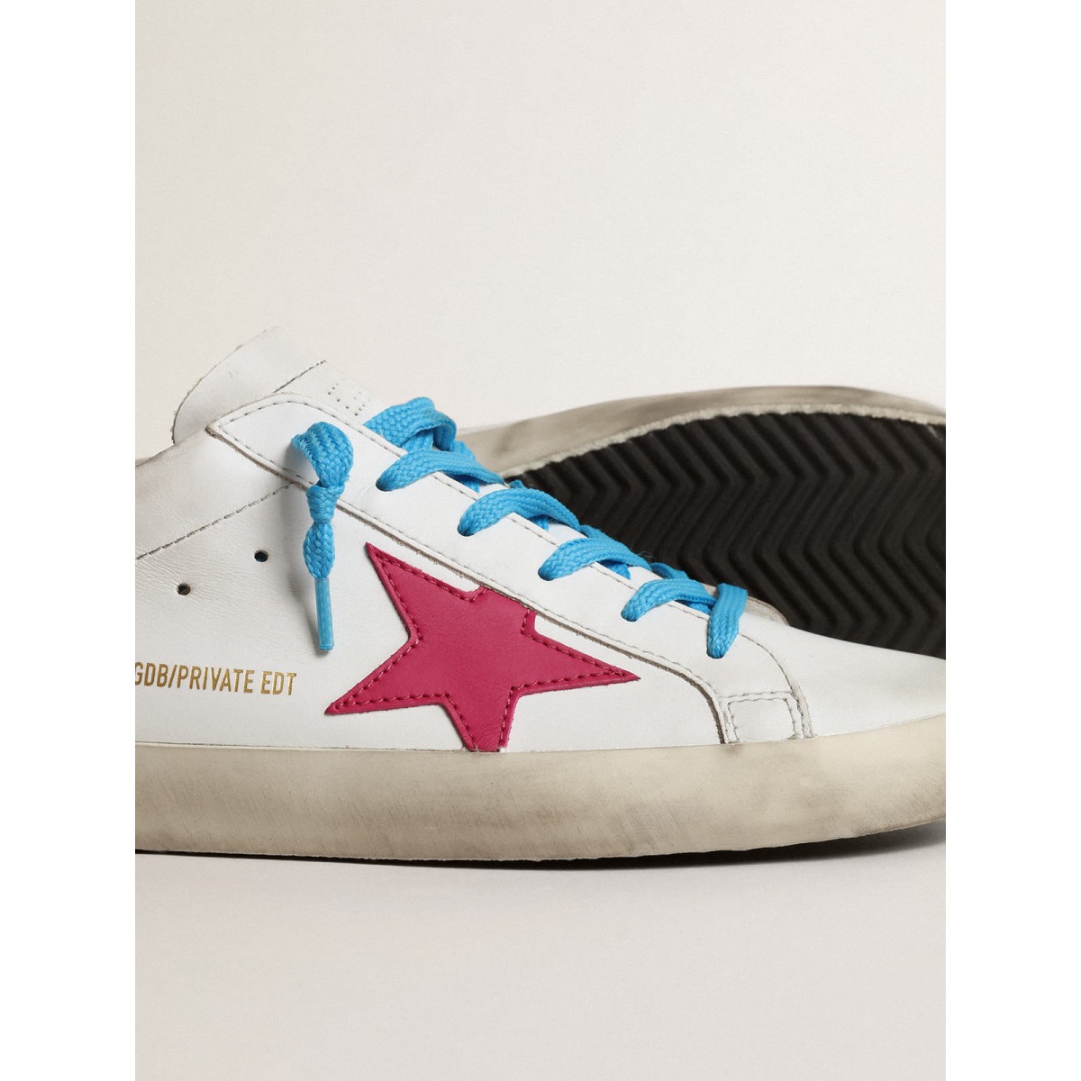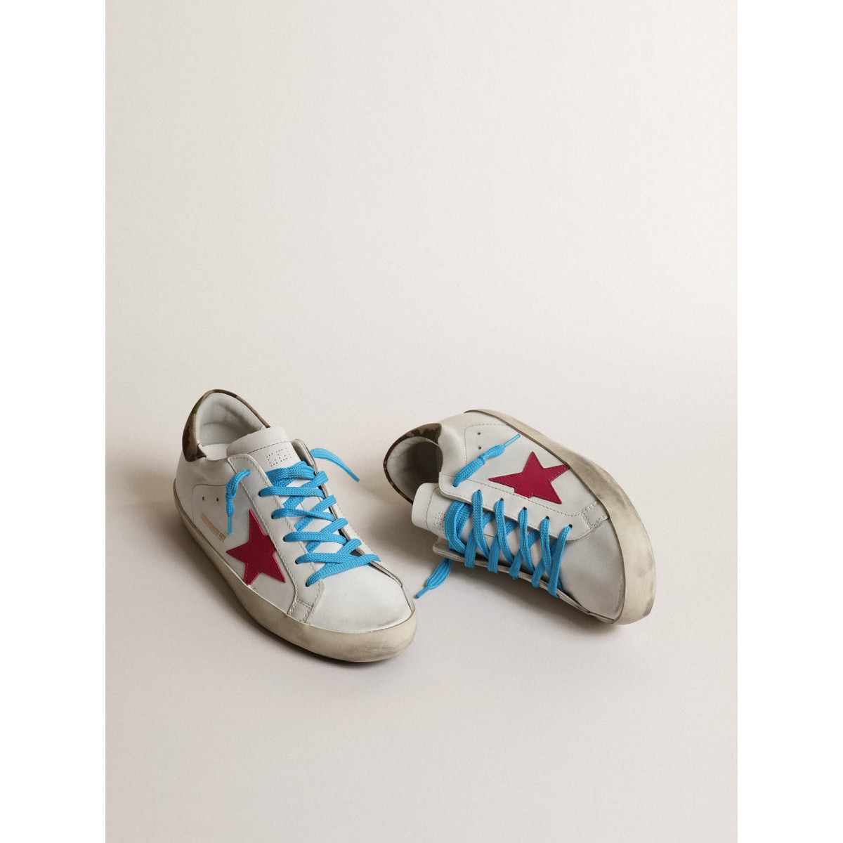 Eine zeitlose Ikone, die sich doch ständig weiterentwickelt. Bei Golden lieben wir es, unsere Klassiker zu nehmen und sie ständig zu überarbeiten, immer aus einem neuen Blickwinkel. In einer limitierten Auflage bieten die Super-Stern-Sneakers dieser Frauen in weißem Leder den Tarn Heel Tab und den Fuchsia-Star. Türkisfarbene Schnürsenkel Fügen Sie den Finishing Touch hinzu. Stern
