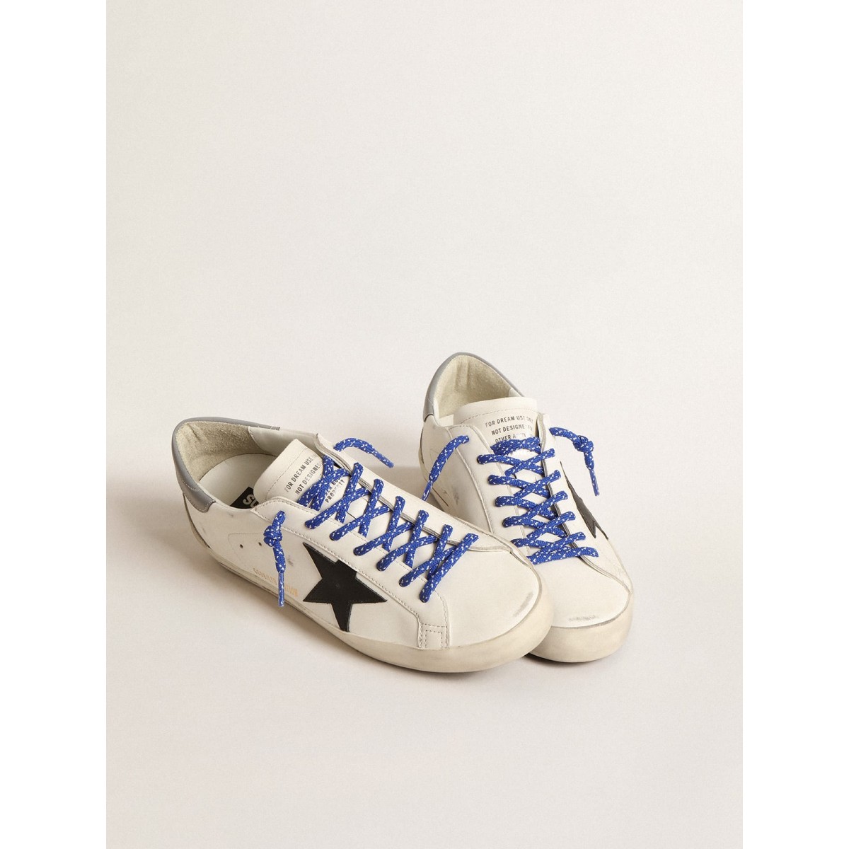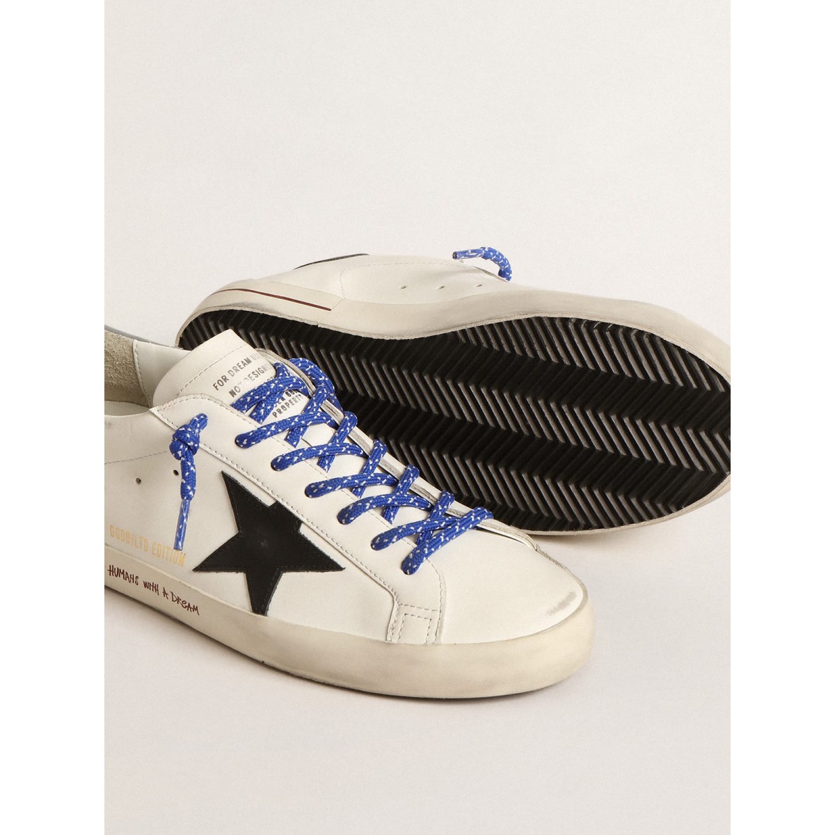 Eine zeitlose Ikone, die sich doch ständig weiterentwickelt. Bei Golden lieben wir es, unsere Klassiker zu nehmen und sie ständig zu überarbeiten, immer aus einem neuen Blickwinkel. Diese Superstar mit einem weißen Leder-Obermaterial verfügen über einen schwarzen Lederstern, eine graue Glasfaserabsatzlasche und einen Eisdelegeinsatz auf der Rückseite. Der kontrastierende Schriftzug auf dem Foxing und den blauen Schnürsenkel mit weißem Punkt Druck hinzufügen den Finishing -Touch. : weiß