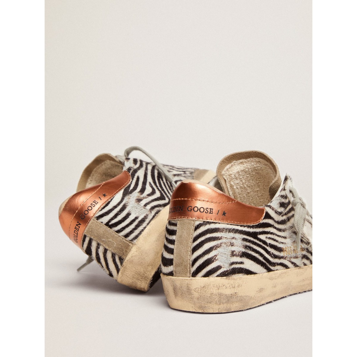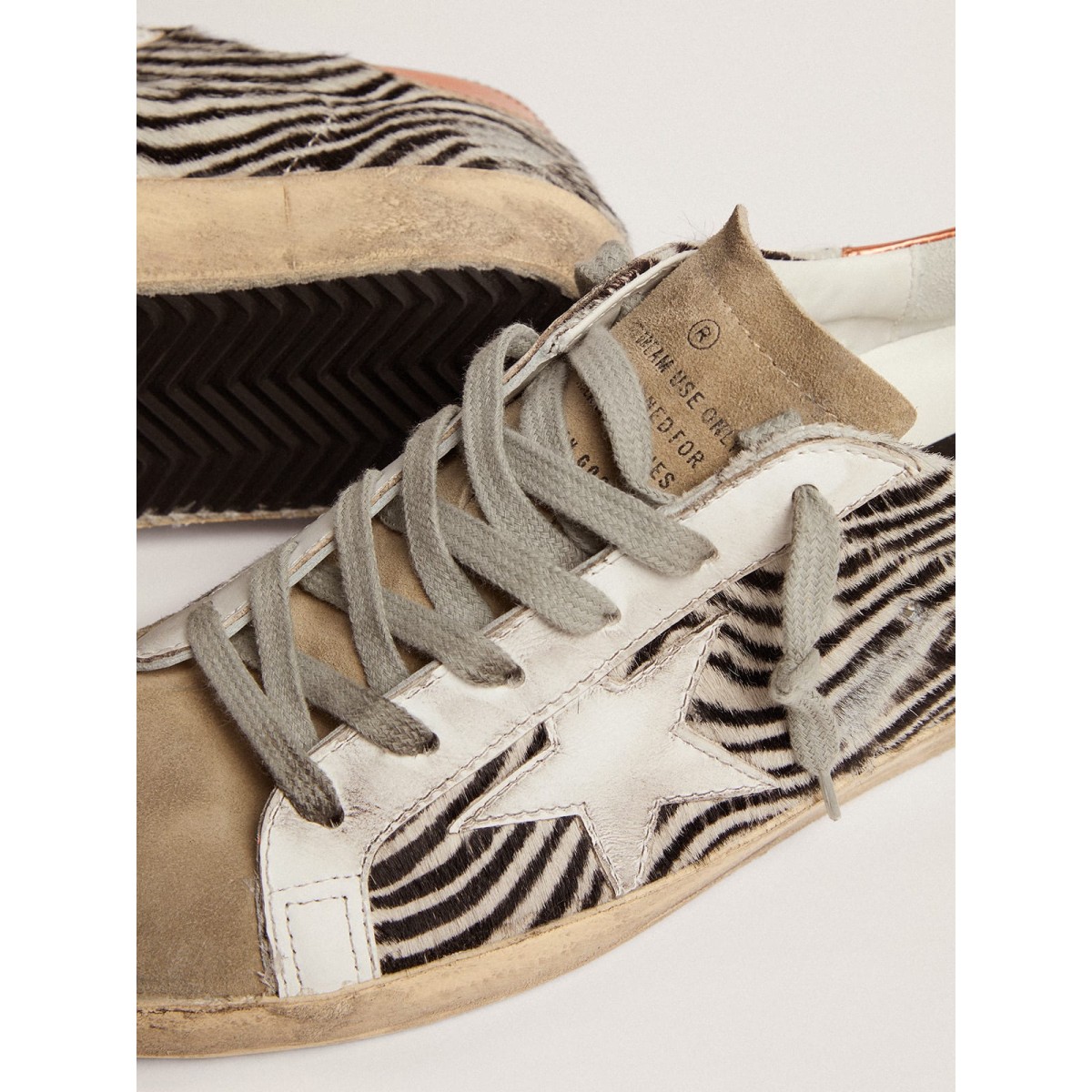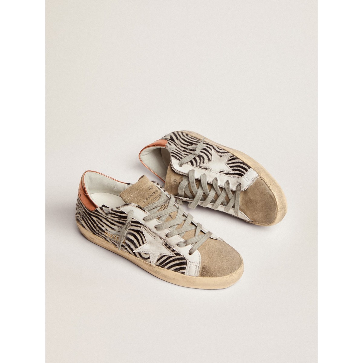 Golden Goose Super-Star Ltd-Turnschuhe in Zebra-Print-Pony-Haut mit weißem Lederstern und orange laminierter Lederabsatz GWF00101.F002702.81575
