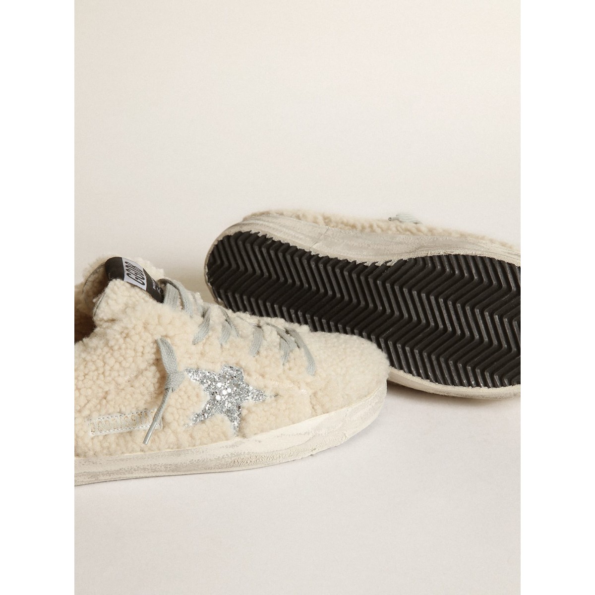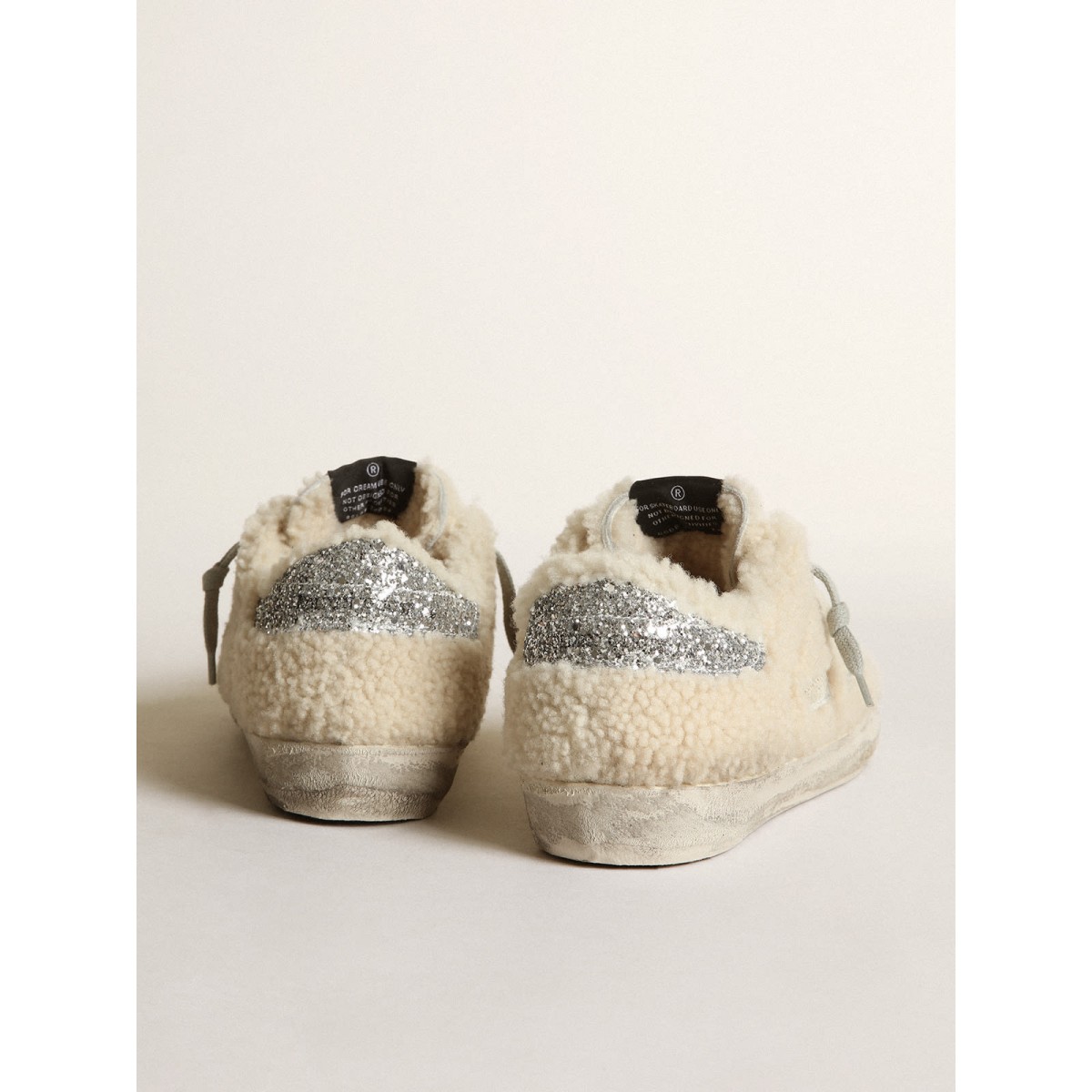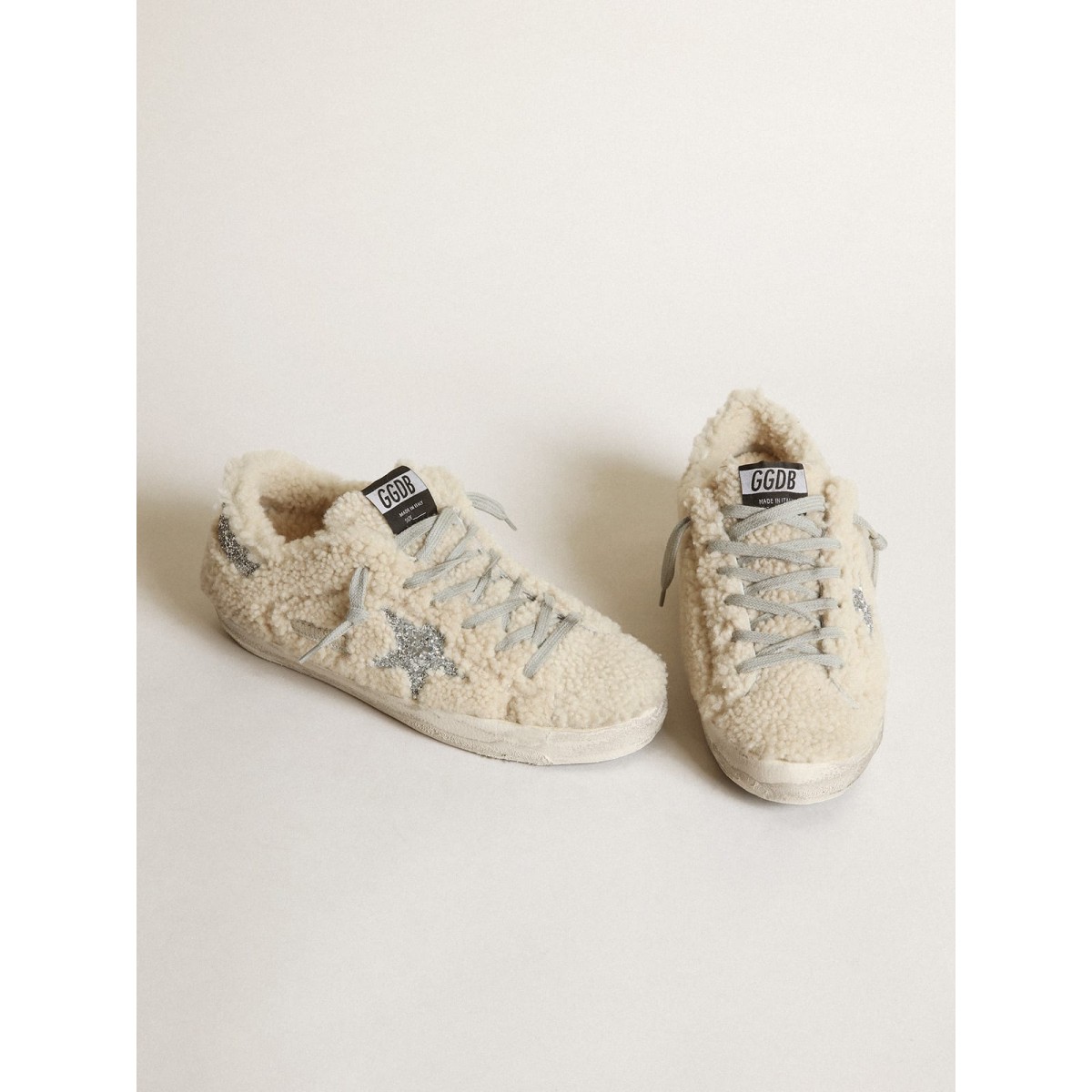 Golden Goose Super-Star-Turnschuhe im Beige Shearling mit Silber Glitterstar und Fersen Tab GWF00174.F000741.15260