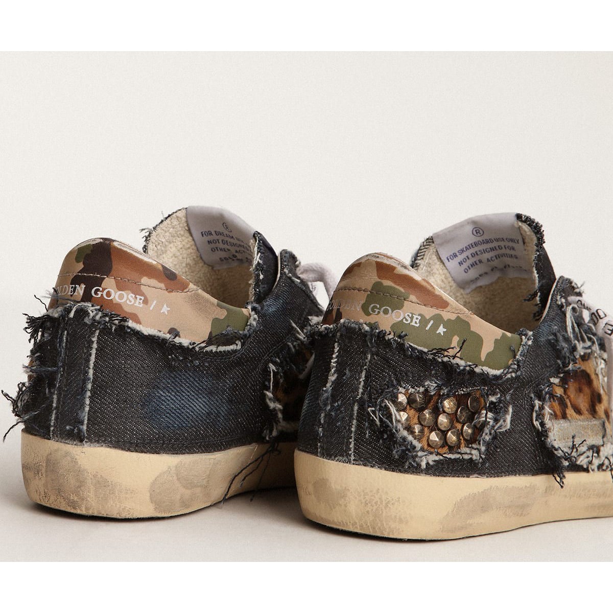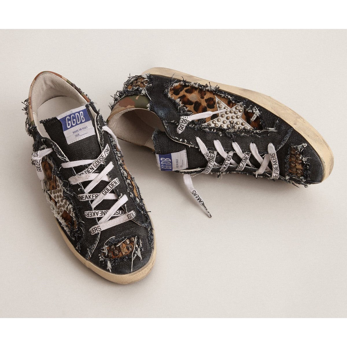 Ein zeitloses Ikon, das sich dennoch weiterentwickelt. Bei Golden lieben wir es, unsere Klassiker zu nehmen und sie ständig zu überarbeiten, immer aus einem neuen Blickwinkel. Diese limitierten Sneakers für das Super-Star-Labor für Frauen sind ein Denim- und Leoparden-Print-Pony-Skin-Obermaterial enthalten, der von einem weißen Lederstern mit Stollen beleuchtet wird. Und die Registerkarte Lederferse mit Camouflage-Print fügt den Finishing-Touch hinzu. Druckpony Skin Obermaterial