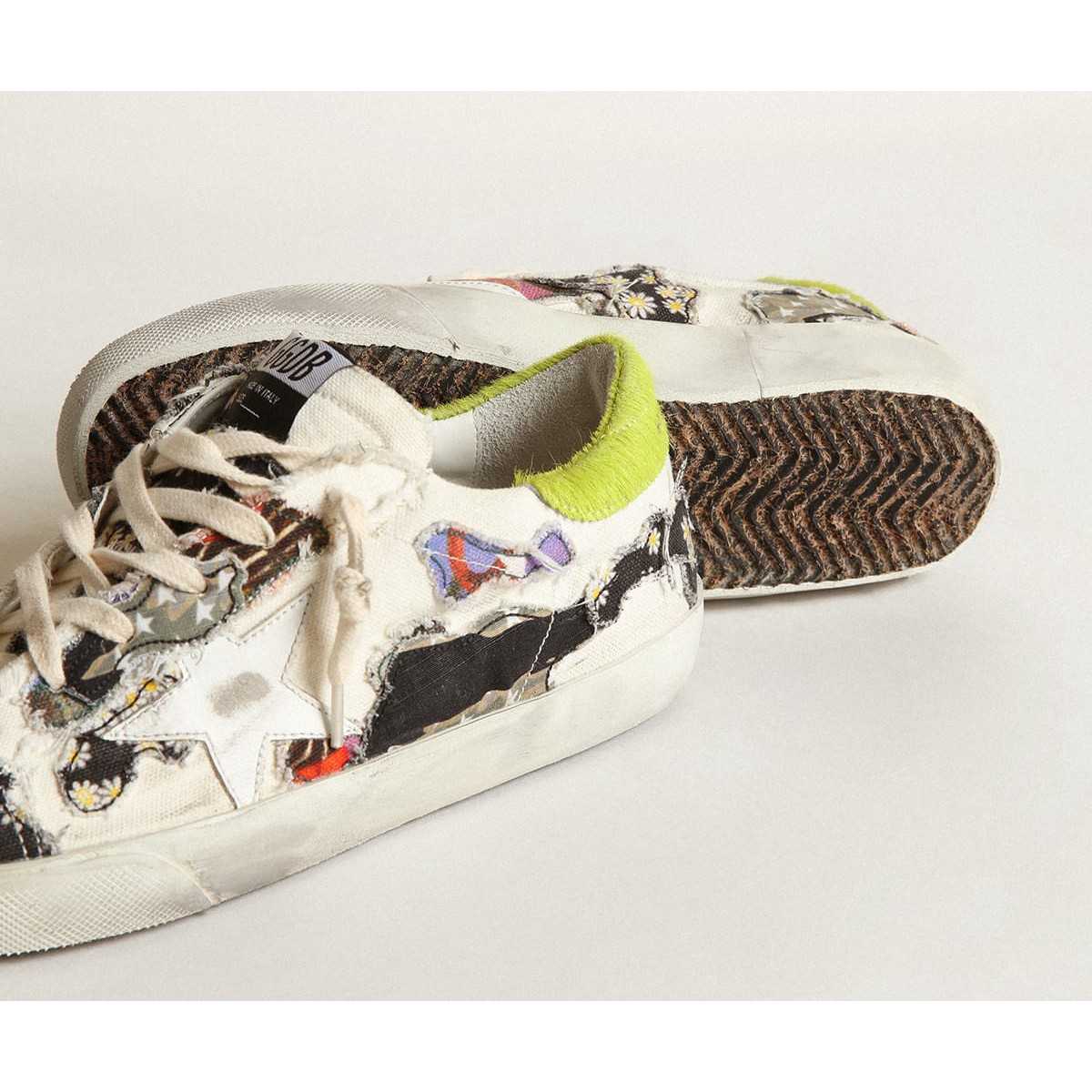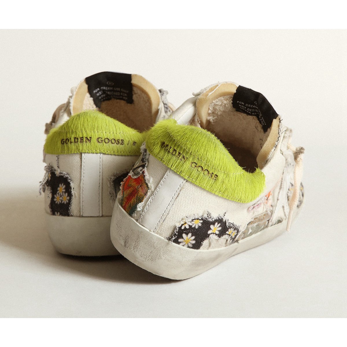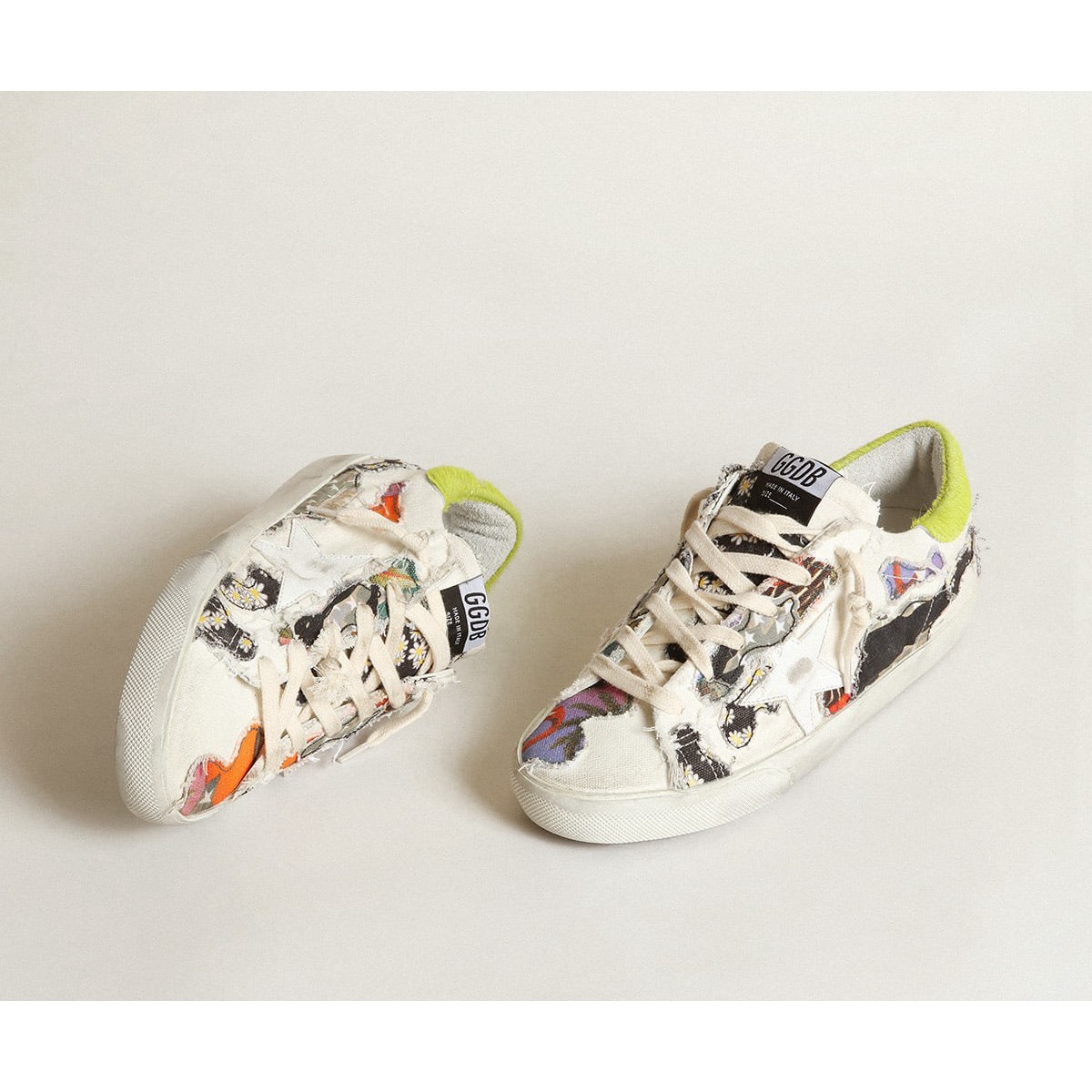 Ein zeitloses Ikon, das sich ständig weiterentwickelt. Bei Golden lieben wir es, unsere Klassiker zu nehmen und sie ständig zu überarbeiten, immer aus einem neuen Blickwinkel. Diese nummerierten Labor -Sneaker in limitierter Auflage bieten ein Obermaterial mit einer umgekehrten Konstruktion in weißer Leinwand mit mehrfarbigen Drucken und einem weißen Lederstern. Die Fersenlasche in kalkgrüner Ponyhaut und die cremefarbenen Schnürsenkel Fügen Sie die Endzahlen hinzu.