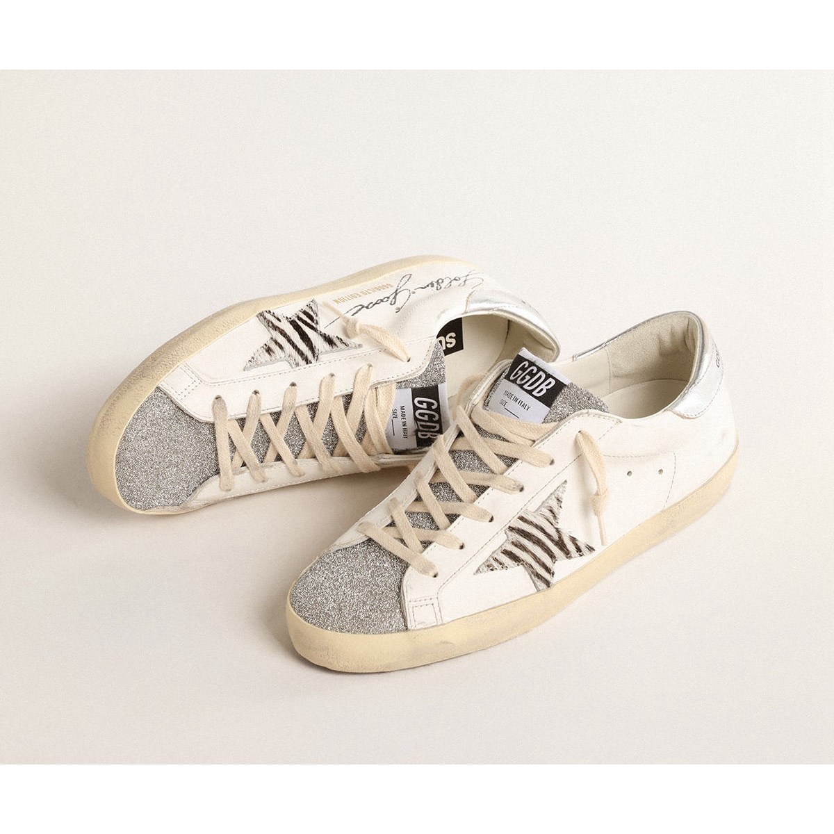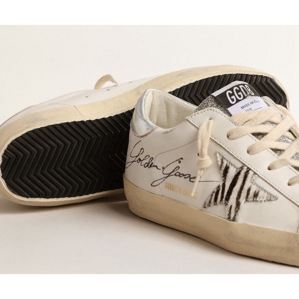 Ein zeitloses Icon, das sich ständig weiterentwickelt. Bei Golden lieben wir es, unsere Klassiker zu nehmen und sie ständig zu überarbeiten, immer aus einem neuen Blickwinkel. Diese Superstar mit einem weißen Leder-Obermaterial verfügen über einen Pony-Skin-Stern im schwarzen und weißen Zebradruck, eine silberne metallische Lederabsatzlasche und eine silberne Swarovski-Kristallzunge. Die kontrastierende schwarze Signatur auf den oberen und cremefarbenen Schnürsenkel fügt den Finishing-Touch hinzu. Farbe: Weiß