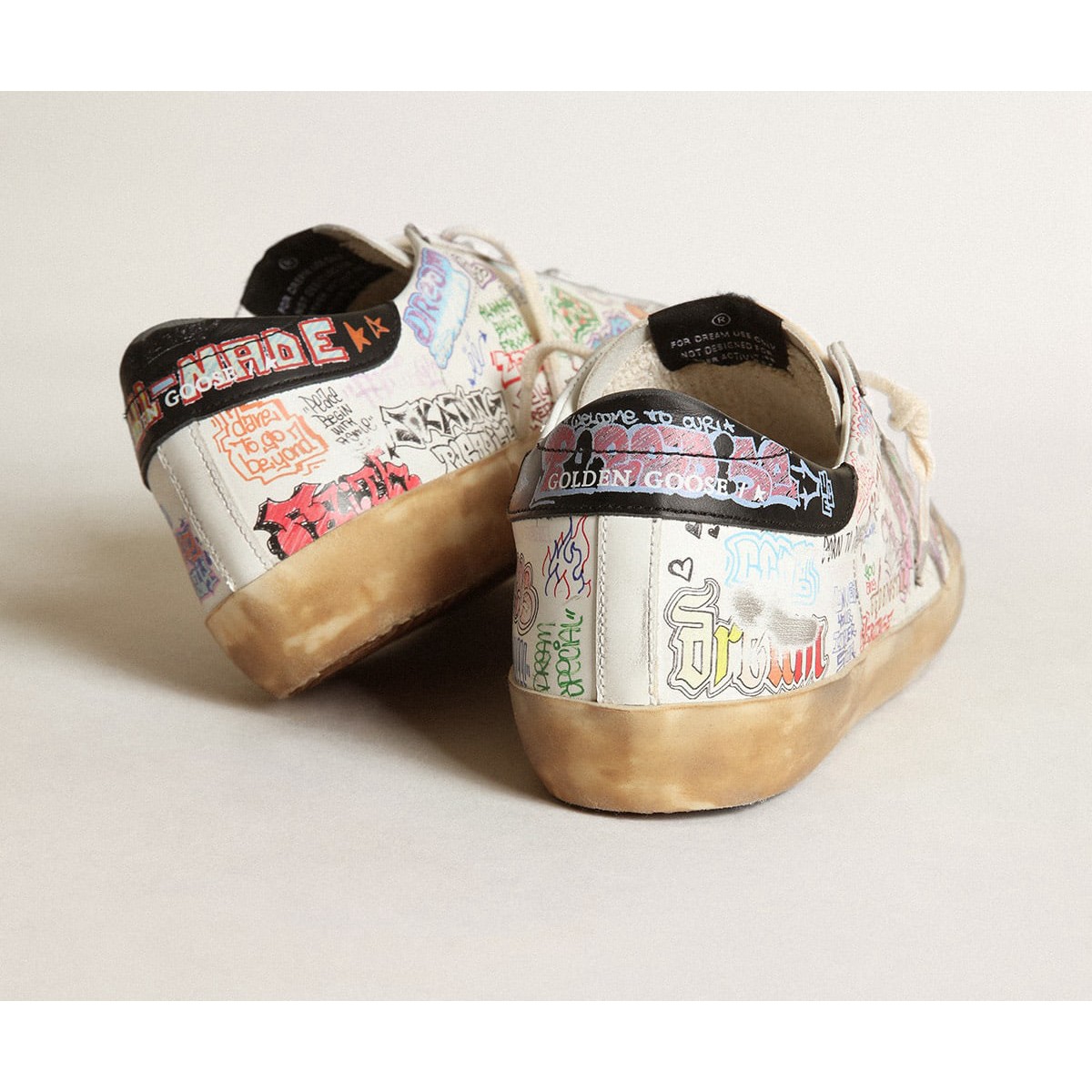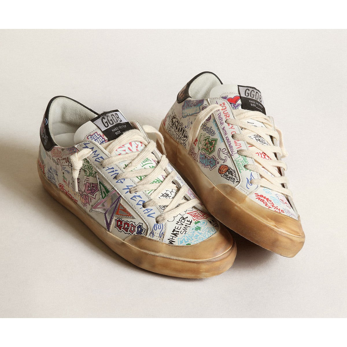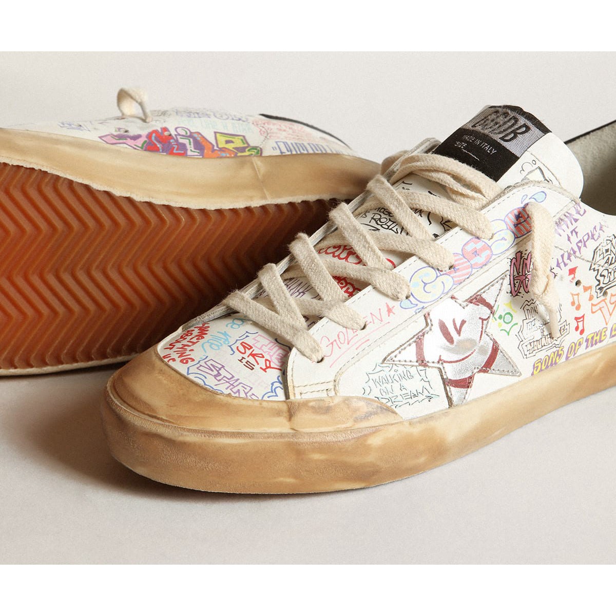 Ein zeitloses Ikon, das sich ständig weiterentwickelt. Bei Golden lieben wir es, unsere Klassiker zu nehmen und sie ständig zu überarbeiten, immer aus einem neuen Blickwinkel. Dieses Frauenmodell mit einem weißen Leder-Obermodell verfügt über eine mehrfarbige Beschriftung von Graffiti-Effekten und einen silbernen metallischen Lederstern. Die schwarze Lederabsatzlasche und cremefarbene Schnürsenkel Fügen Sie die letzten Schliff hinzu. Weiß