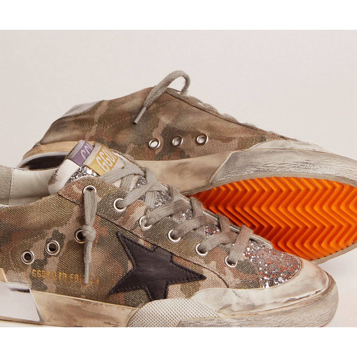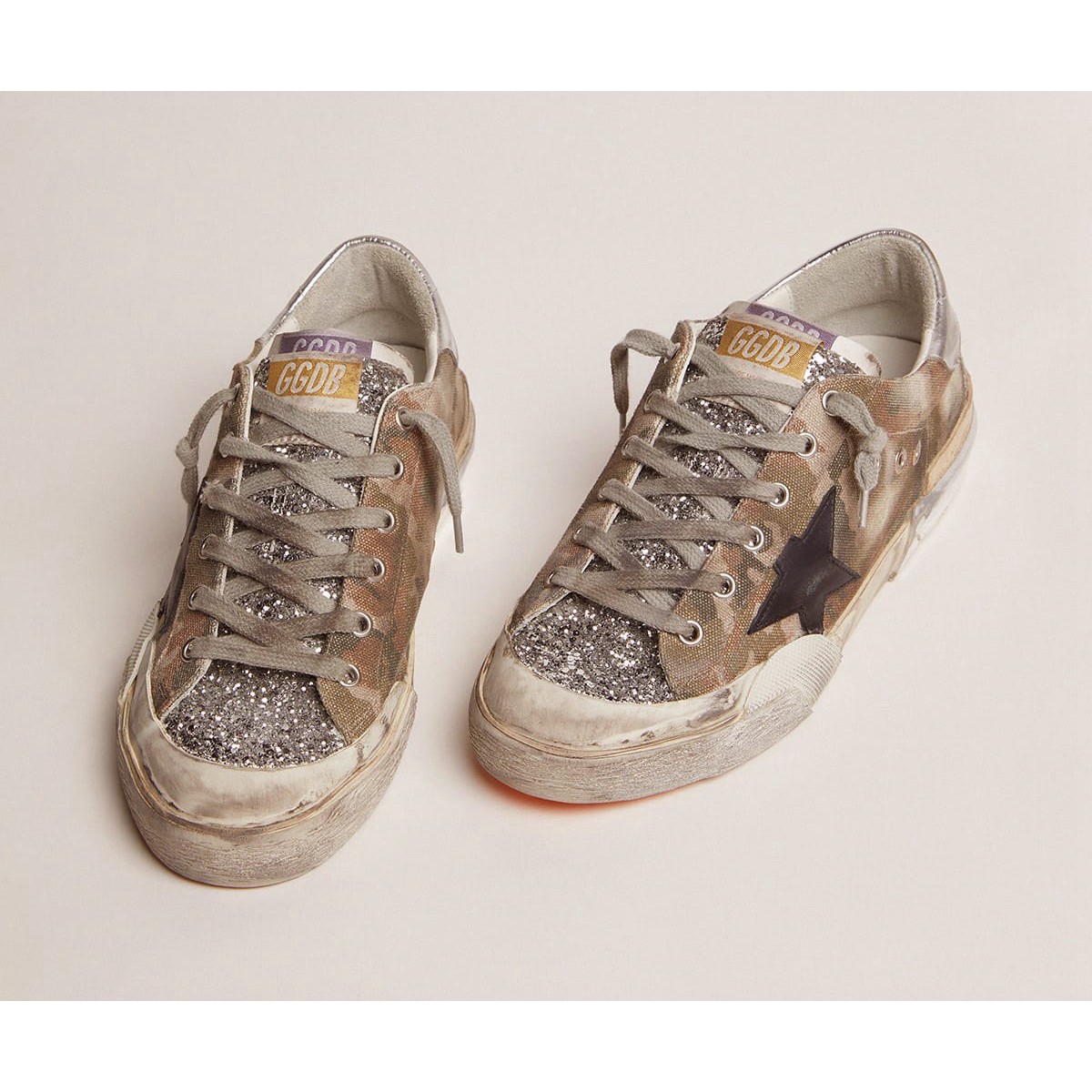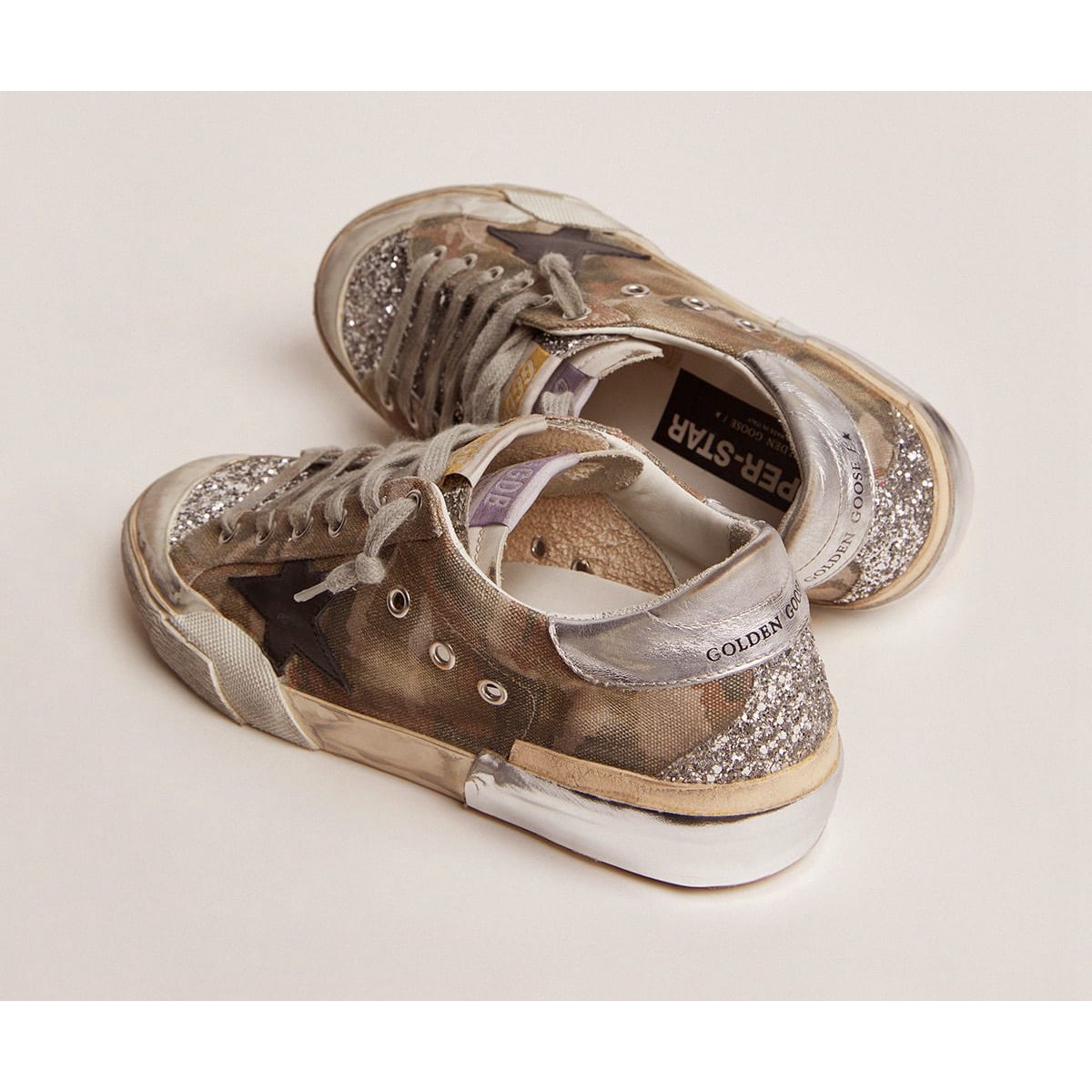 Ein zeitloses Ikon, das sich noch ständig weiterentwickelt. Bei Golden lieben wir es, unsere Klassiker zu nehmen und sie ständig zu überarbeiten, immer aus einem neuen Blickwinkel. Diese limitierten Sneakers für das Super-Star-Labor für Frauen sind ein Tarn-Leinwand-Obermaterial mit silbernen Glitzer-Einsätzen und Multi-Foxing. Diese komplexe handwerkliche Handwerkskunst beinhaltet die Zugabe von zusätzlichem Fuchs, das sich von Anfang an in Ton und Textur unterscheidet. P>