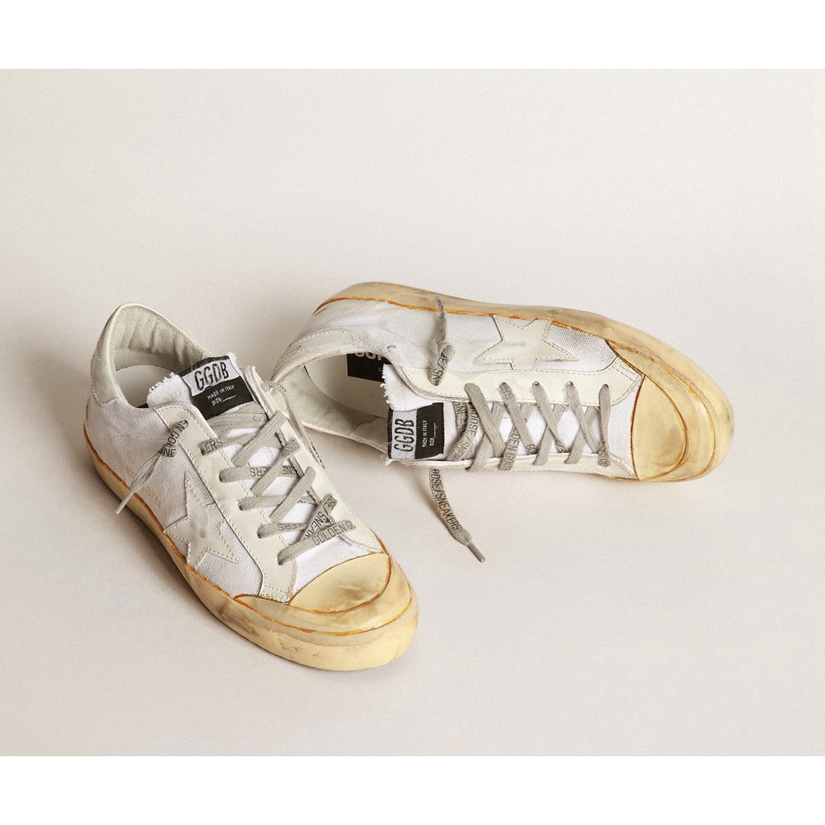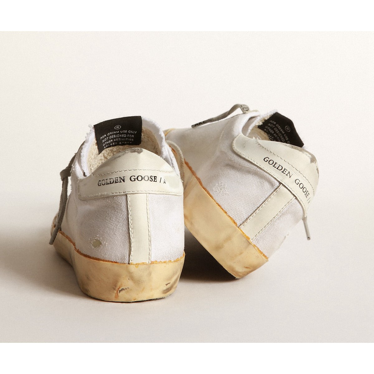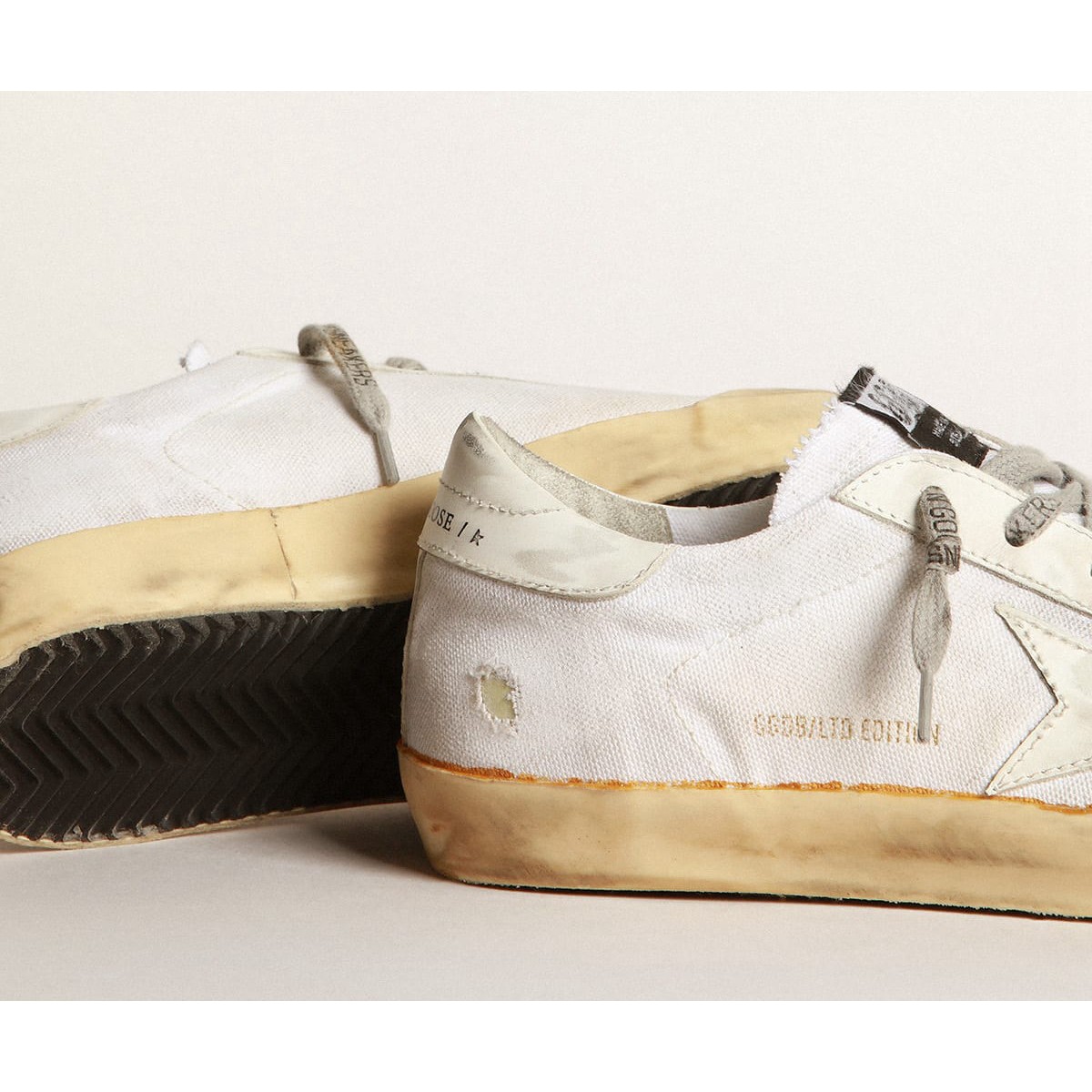 Ein zeitloses Symbol, das sich dennoch weiterentwickelt. Bei Golden lieben wir es, unsere Klassiker zu nehmen und sie ständig zu überarbeiten, immer aus einem neuen Blickwinkel. Diese nummerierten Labor-Sneaker in limitierter Auflage bieten ein optisches Obermaterial mit weißem Canvas mit rohem Kanten und einem Stern- und Fersenlasche in Ton-auf-Ton-Leder. Die weißen Socken mit silbernen Strasssteinen und eisgrauen Schnürsenkel mit kontrastierendem schwarzem Logo fügen Sie den Finishing-Touch hinzu.