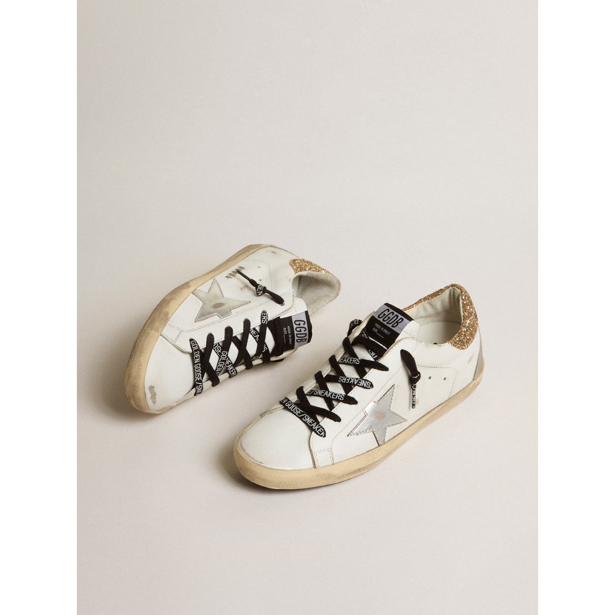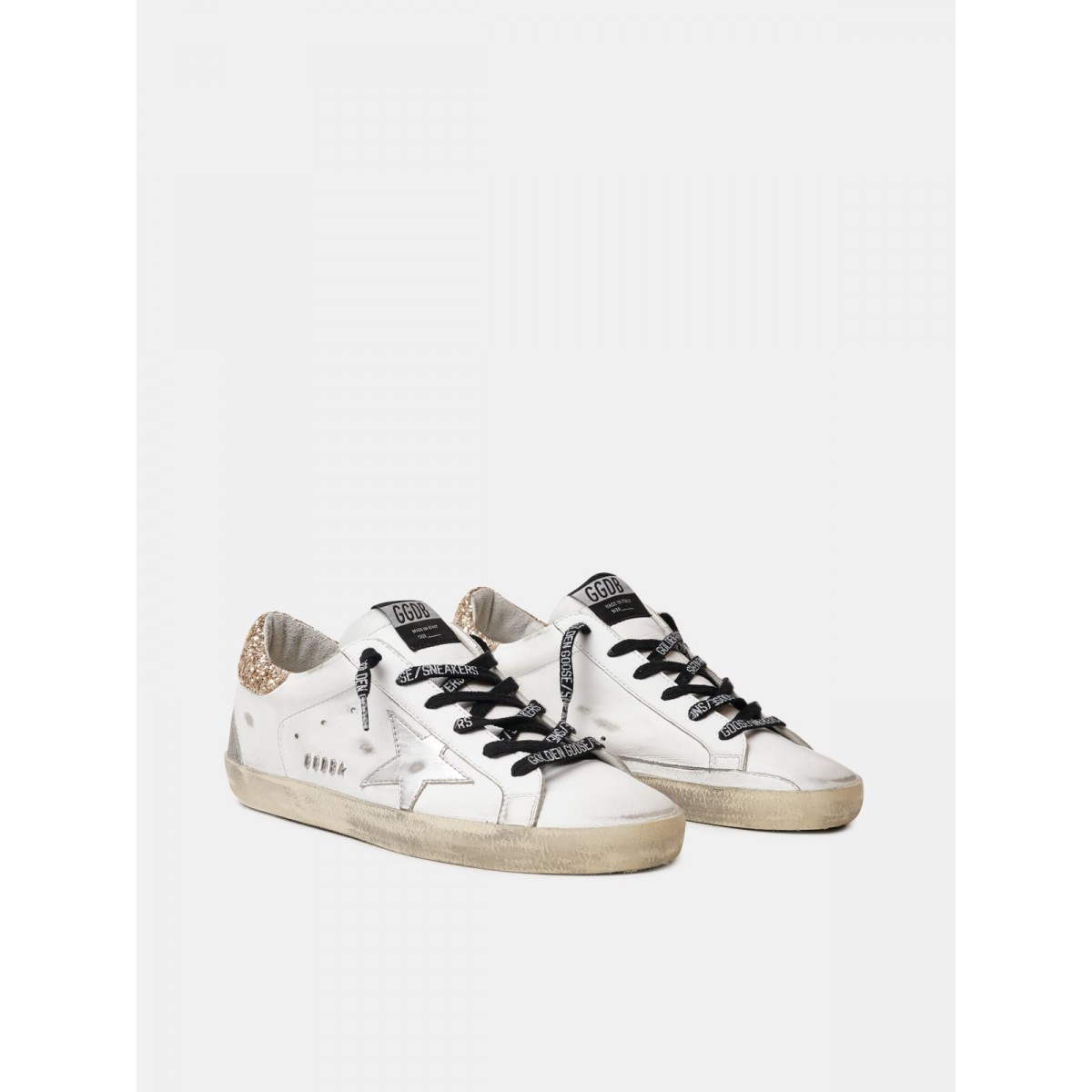 Wir erstellen Klassiker und aktualisieren sie, um neue zu machen. Wir haben das Design dieser weißen Leder-Super-Stern-Sneakers dank der glitzernden goldenen Absatzstätte verbessert. Ein Hauch von Glamour für zusätzlichen Stil. Mit goldenem Glitzer