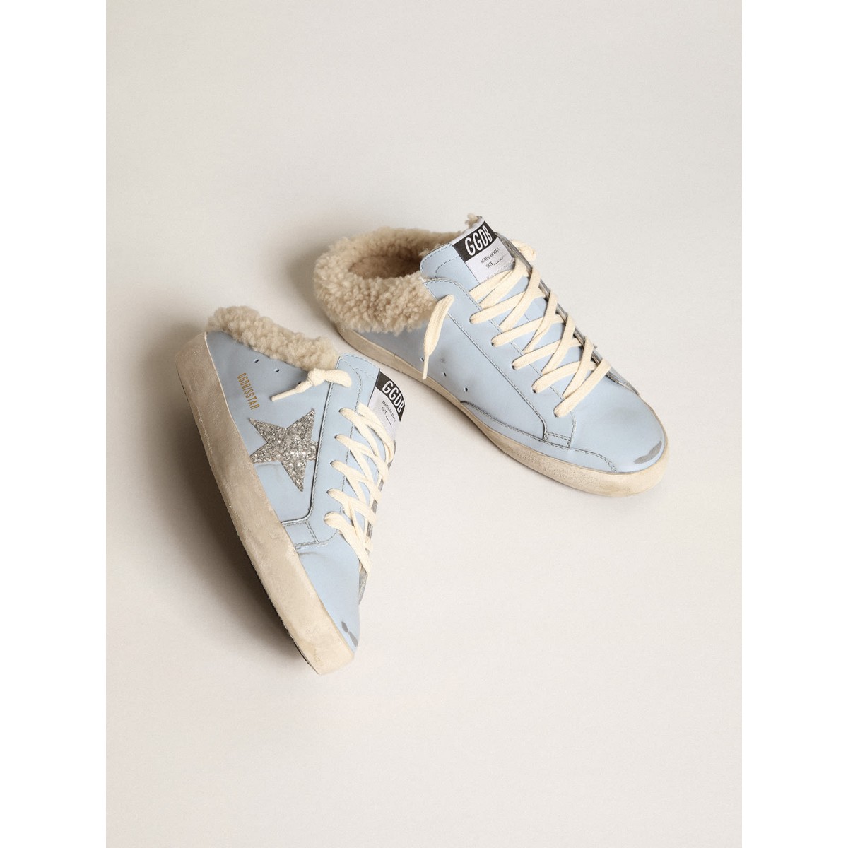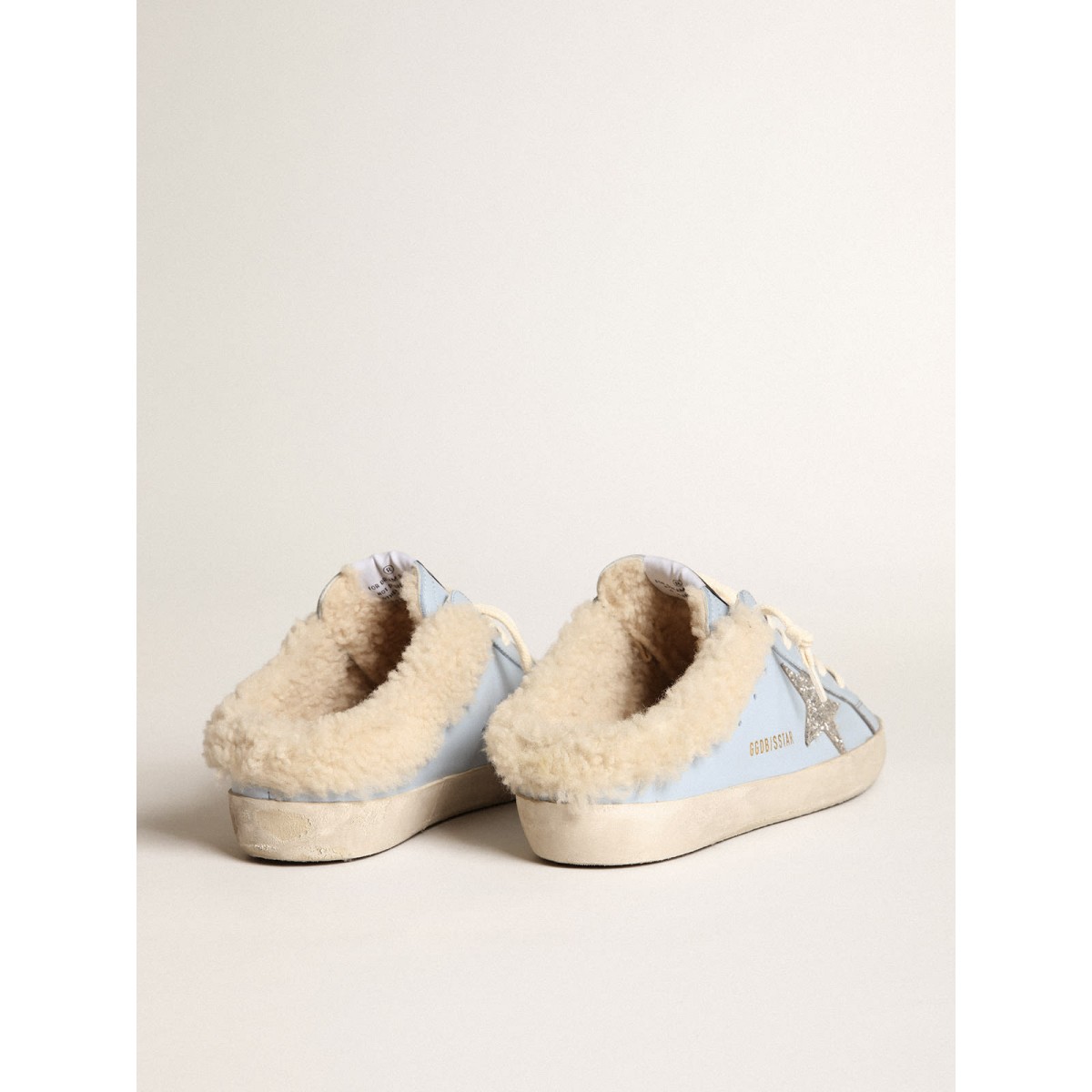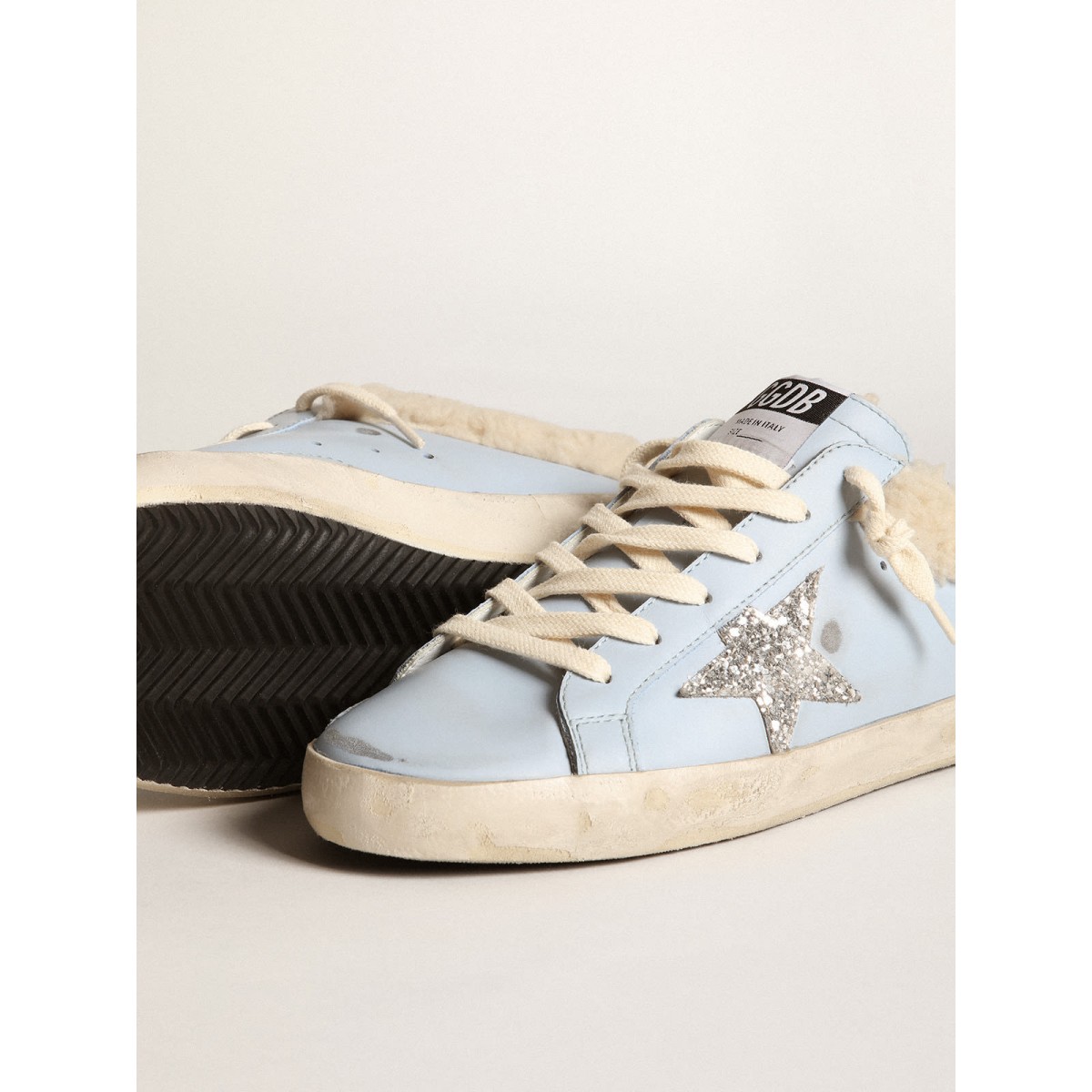 Unsere legendären Turnschuhe in der neuen Sabot-Version: Diese Superstar-Sneakers mit weichem beige Shearling verfügen über ein pulverblaues Leder, das mit einem silbernen Glitzer-Stern akzentuiert ist. Die cremefarbenen Schnürsenkel vervollständigen den Look.>Silber Glitterstar