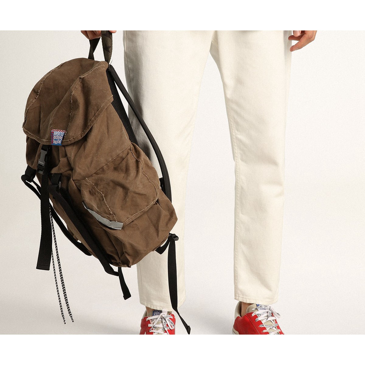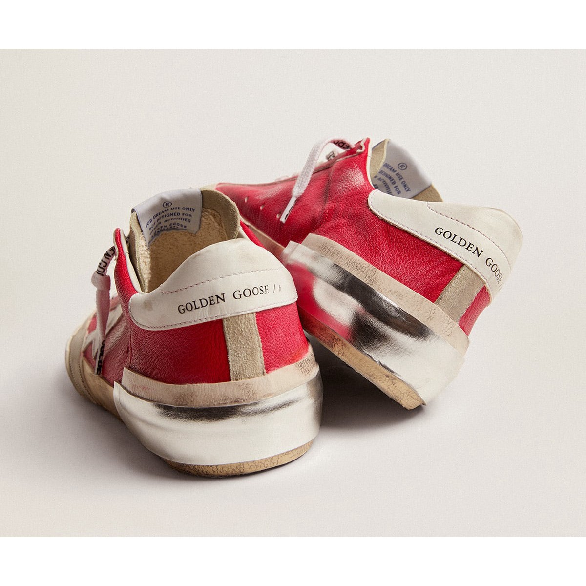 Ein zeitloses Symbol, das sich noch ständig weiterentwickelt. Bei Golden lieben wir es, unsere Klassiker zu nehmen und sie ständig zu überarbeiten, immer aus einem neuen Blickwinkel. Unerwartete Details lassen diese Super-Stern-Turnschuhe hervorheben: Das obere Leder mit dem roten Nappa-Leder bietet einen weißen Lederstern und eine Fersenlasche und eine graue Wildlederzunge, während das Foxing vielfältig ist. Dies ist eine komplexe handwerkliche Technik, die die Zugabe verschiedener Texturen und Foxingschattierungen umfasst: in glattem, metallischem silberfarbenem Leder und milchweißem gehämmertem Leder. .