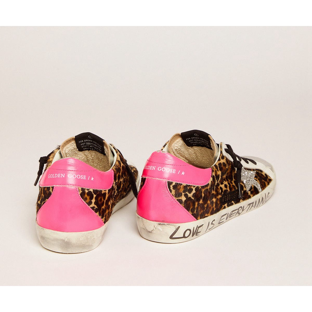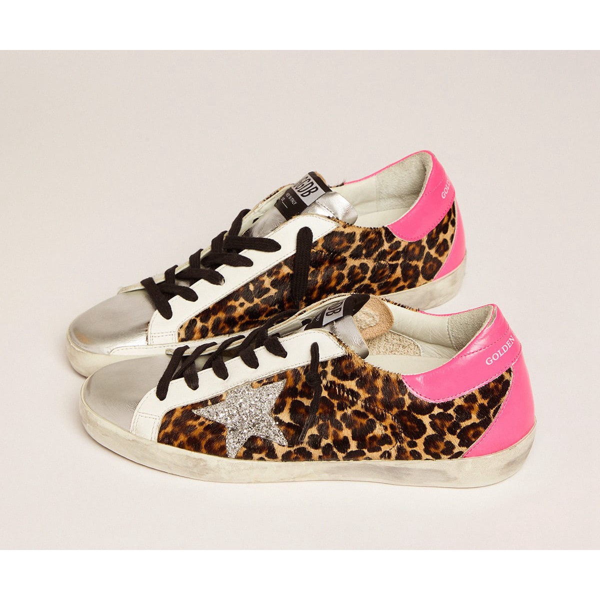 Ein zeitloses Symbol, das sich ständig weiterentwickelt. Bei Golden lieben wir es, unsere Klassiker zu nehmen und sie ständig zu überarbeiten, immer aus einem neuen Blickwinkel. Silbere Details wie der Glitzerstar und die Metallic Lederzunge lassen das Oberhaut des Leoparden-Print-Pony-Hauts dieses Stils leuchten. Die Neon Fuchsia Lederferse Tab und Handschrift auf dem Fuchs fügen den letzten Schliff hinzu. Liebe ist alles. Silver Glitterstar