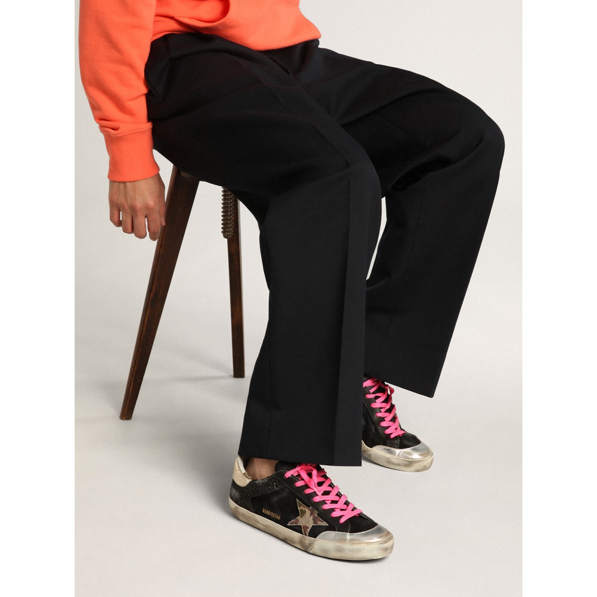 Eine zeitlose Ikone, die sich doch ständig weiterentwickelt. Bei Golden lieben wir es, unsere Klassiker zu nehmen und sie ständig zu überarbeiten, immer aus einem neuen Blickwinkel. Unerwartete Details lassen diese Super-Stern-Turnschuhe hervorheben: Der Upper Black Glitter und Wildleder hat einen Ripstop-Stern der Tarngedruckt. Der Zeh in metallisch silberfarbenem Leder und die Fuchsia-Schnürsenkel fügen die Endzüge hinzu. Utende-Obermaterial