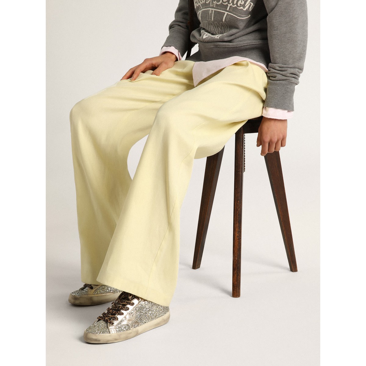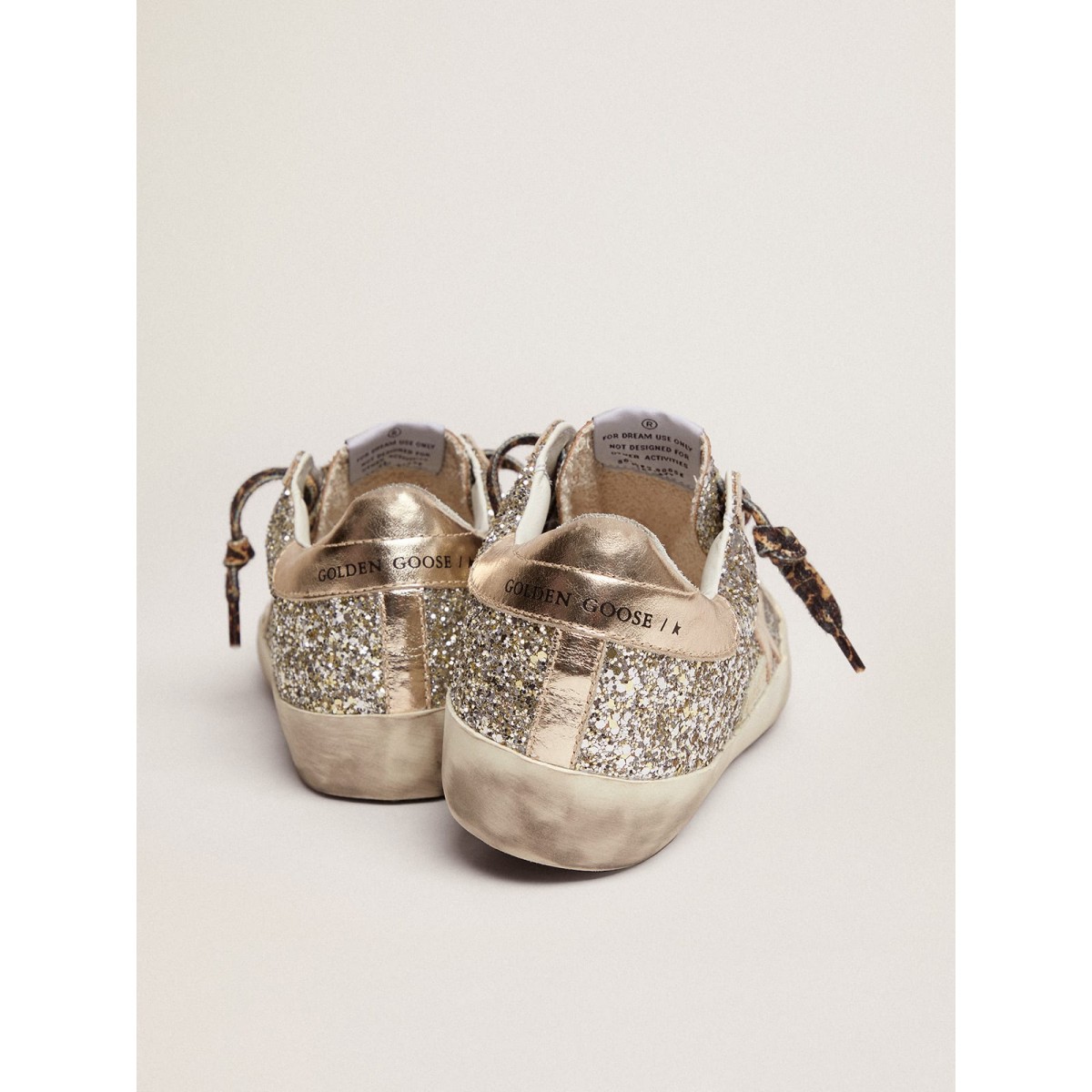 Eine zeitlose Ikone, die sich doch ständig weiterentwickelt. Bei Golden lieben wir es, unsere Klassiker zu nehmen und sie ständig zu überarbeiten, immer aus einem neuen Blickwinkel. Diese Super-Stern-Turnschuhe mit platinfarbenem Glitzer-Obermaterial haben Ton-auf-Ton-Tone-Ledereinsätze, einschließlich der Registerkarte Stern und Fersen. Die Schnürsenkel beige und brauner Leoparden-Print Fügen Sie den Finishing Touch hinzu.