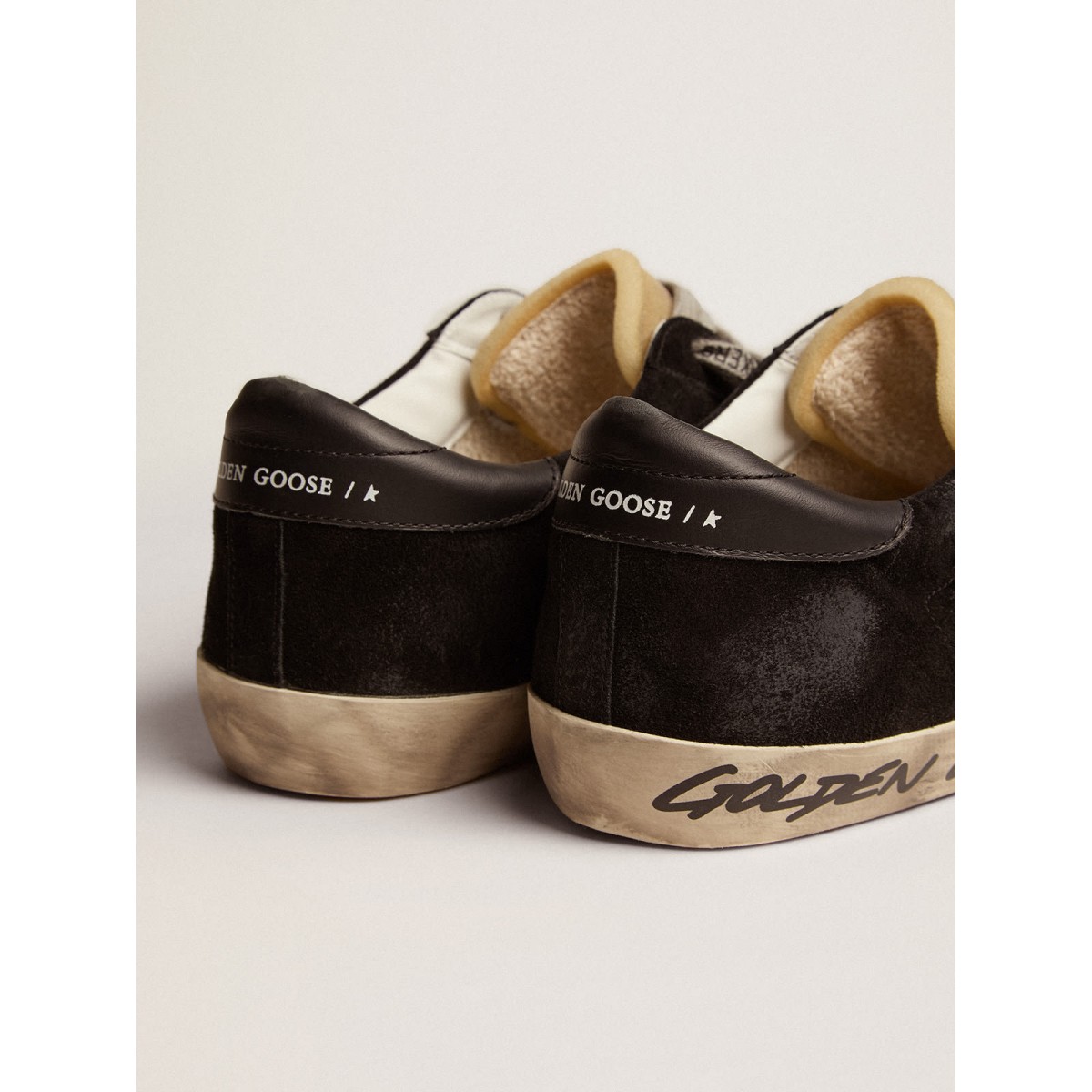 Eine zeitlose Ikone, die sich doch ständig weiterentwickelt. Bei Golden lieben wir es, unsere Klassiker zu nehmen und sie ständig zu überarbeiten, immer aus einem neuen Blickwinkel. Diese Super-Stern-Turnschuhe mit schwarzem Wildleder-Obermaterial bieten einen silbernen Metallic Lederstar, einen schwarzen Lederabsatzstab und einen schief gedruckten Golden Goose-Logo auf dem Fuchs. Die Eisgrau Schnürsenkel mit kontrastierendem schwarzem Logo vervollständigen den Look.