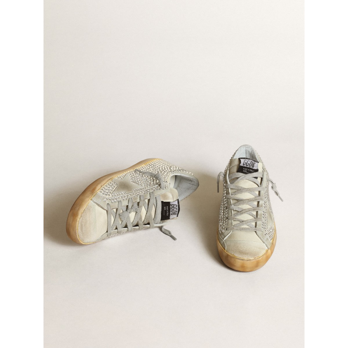 Eine zeitlose Ikone, die sich doch ständig weiterentwickelt. Bei Golden lieben wir es, unsere Klassiker zu nehmen und sie ständig zu überarbeiten, immer aus einem neuen Blickwinkel. Diese Super-Stern-Turnschuhe mit einem cremefarbenen Nubuck-Obermaterial mit All-Over-Silber-Swarovski-Kristallen verfügen über einen eisgrauen Wildlederstern und eine cremefarbene Nubuck-Zunge. Und Eisgrau Schnürsenkel Fügen Sie den letzten Schliff hinzu. Kristalle