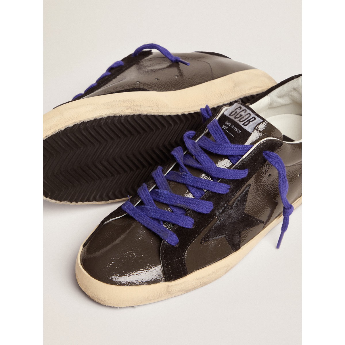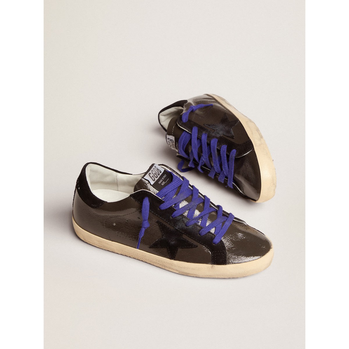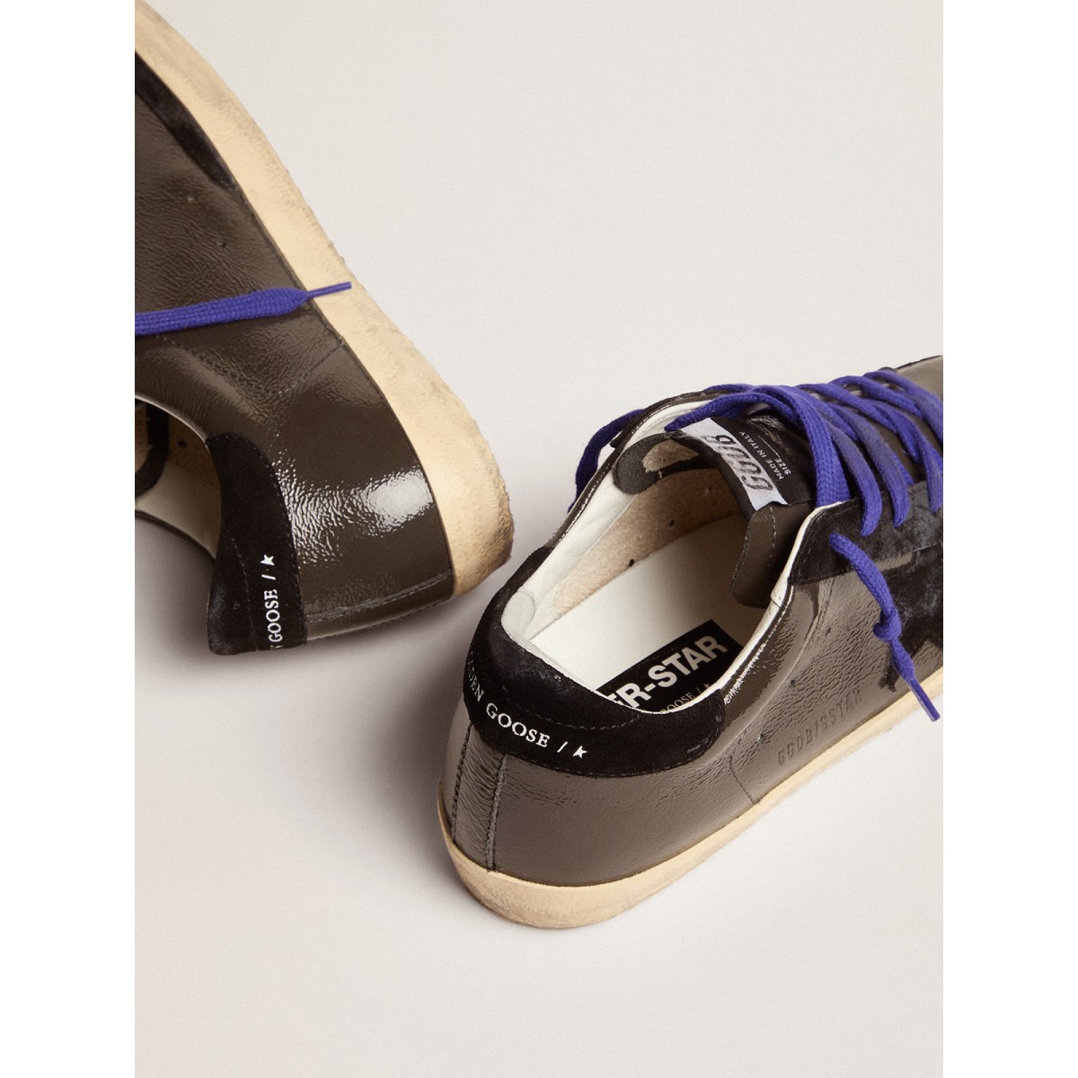 Eine zeitlose Ikone, die sich doch ständig weiterentwickelt. Bei Golden lieben wir es, unsere Klassiker zu nehmen und sie ständig zu überarbeiten, immer aus einem neuen Blickwinkel. Diese Super-Stern-Turnschuhe mit grauem Lackleder-Obermaterial bieten schwarze Wildledereinsätze, einschließlich des Sterns und der Fersenlasche. Und blaue Schnürsenkel Fügen Sie den stilvollen Schliff hinzu. Schwarze Wildledereinsätze