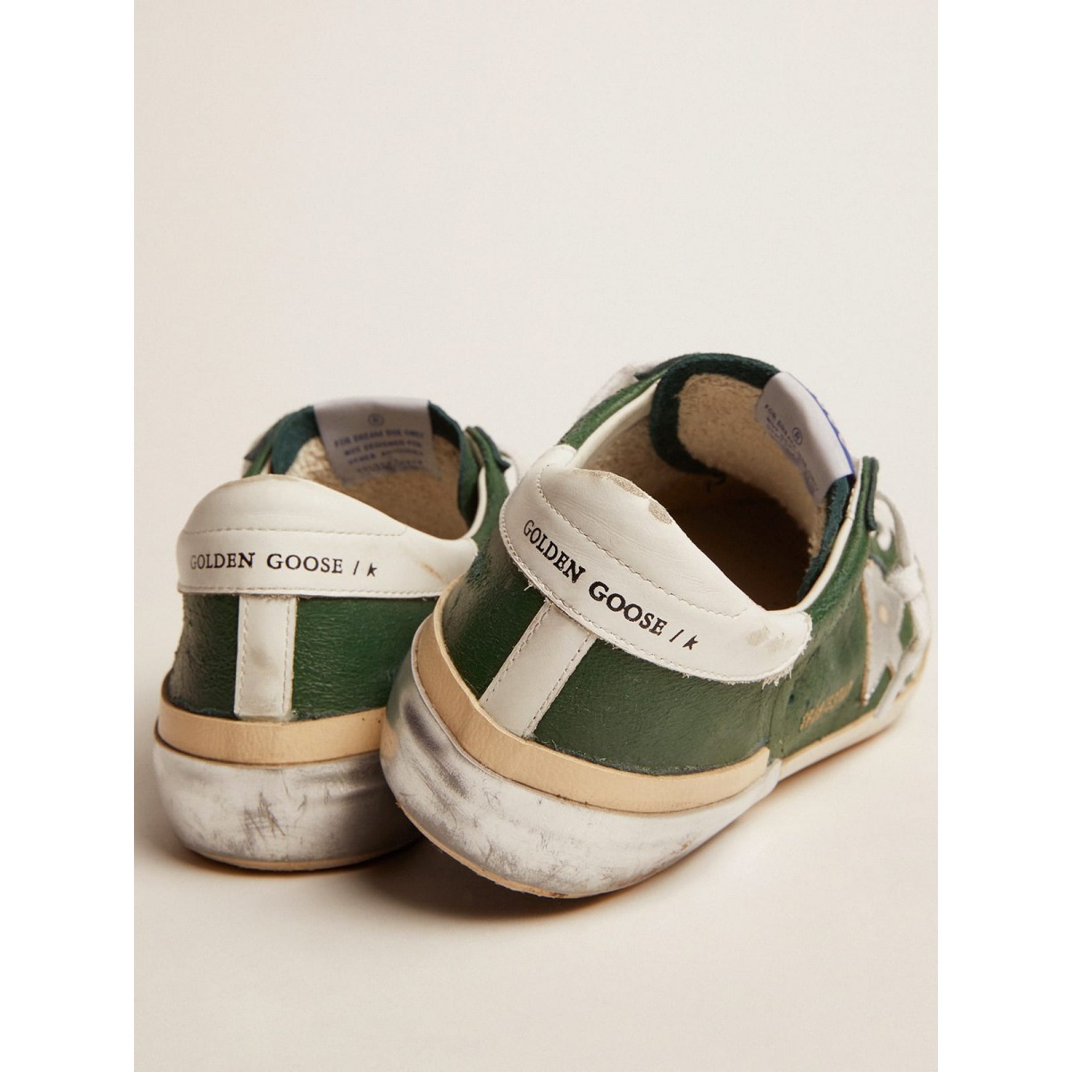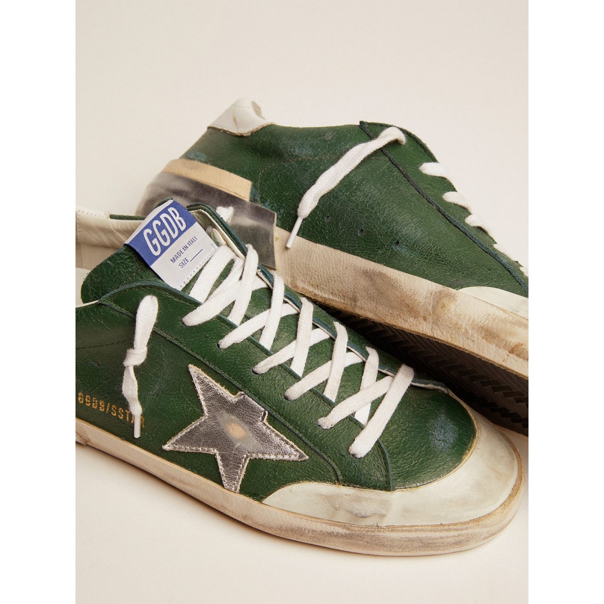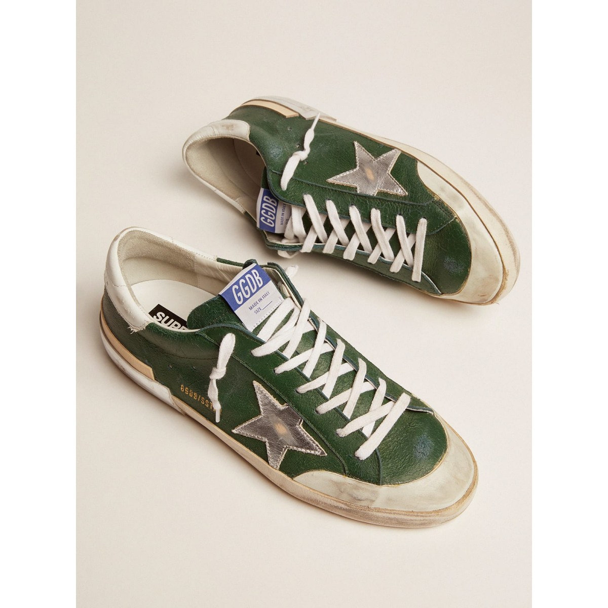 Eine zeitlose Ikone, die sich doch ständig weiterentwickelt. Bei Golden lieben wir es, unsere Klassiker zu nehmen und sie ständig zu überarbeiten, immer aus einem neuen Blickwinkel. Diese grünen Leder-Super-Stern-Sneakers verfügen über mehrfuchs, komplexe handwerkliche Handwerkskunst, die die Zugabe von zusätzlichem Fuchs beinhaltet, das sich von Anfang an in Ton und Textur unterscheidet. Und der silberlaminierte Lederstern und die weiße Lederferse -Registerkarte Fügen Sie die letzten Schliff hinzu.