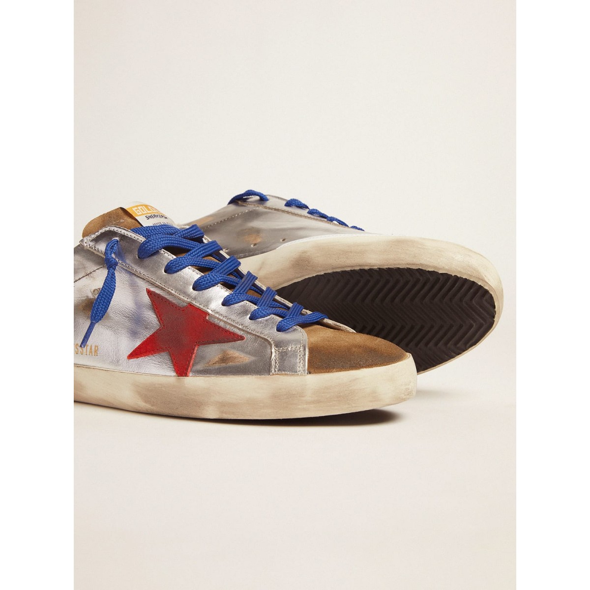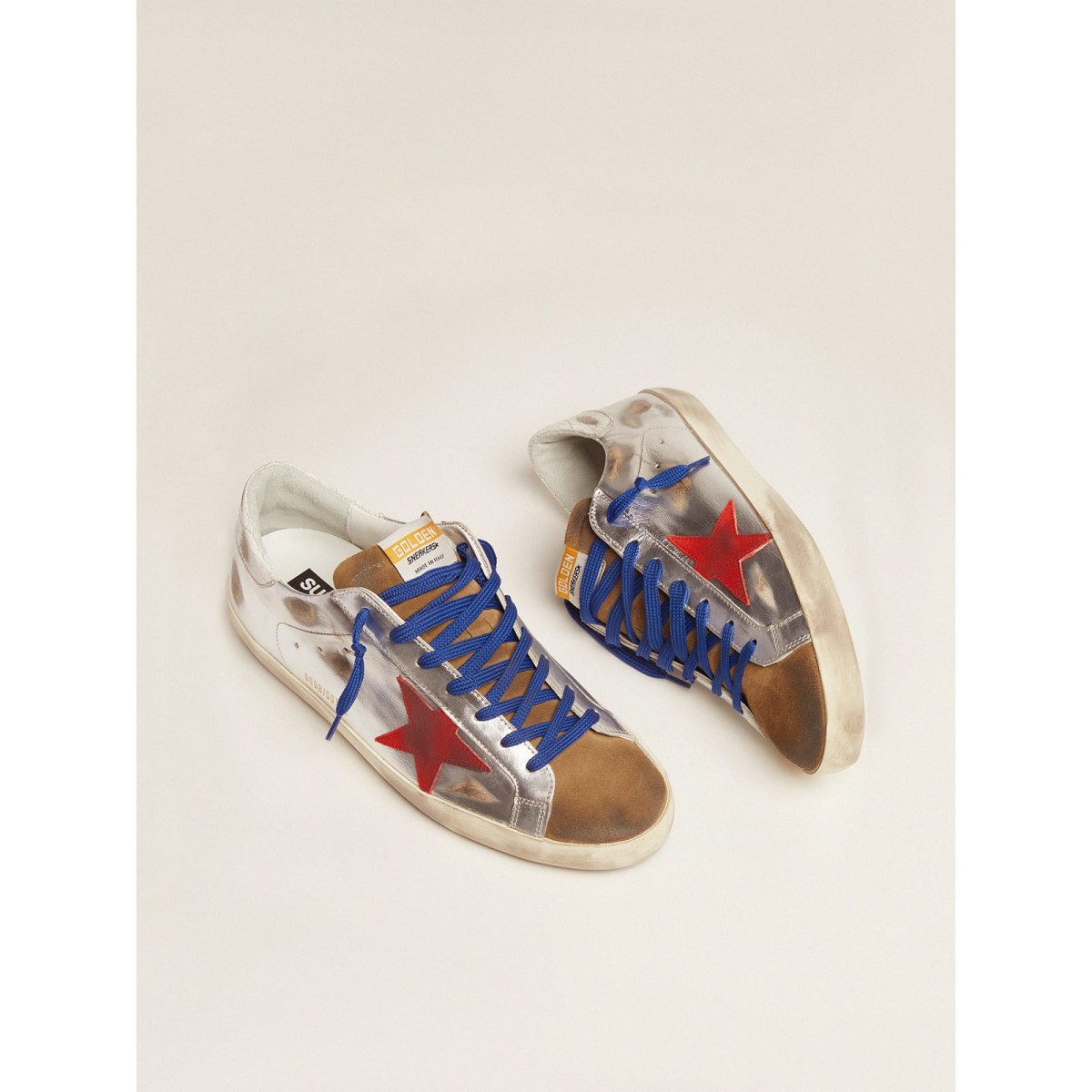 Mit unseren Turnschuhen spielen wir gerne mit Kontrasten herum, schaffen einzigartige Kombinationen und schreiben die klassischen Regeln neu. Wir haben es mit diesen Superstars wieder gemacht: aus laminiertem Leder und Wildleder und eine knackige Fersenlasche, ein roter Wildlederstern und blaue Schnürsenkel.>Artikel Nr. GMF00101.F001437.80992
