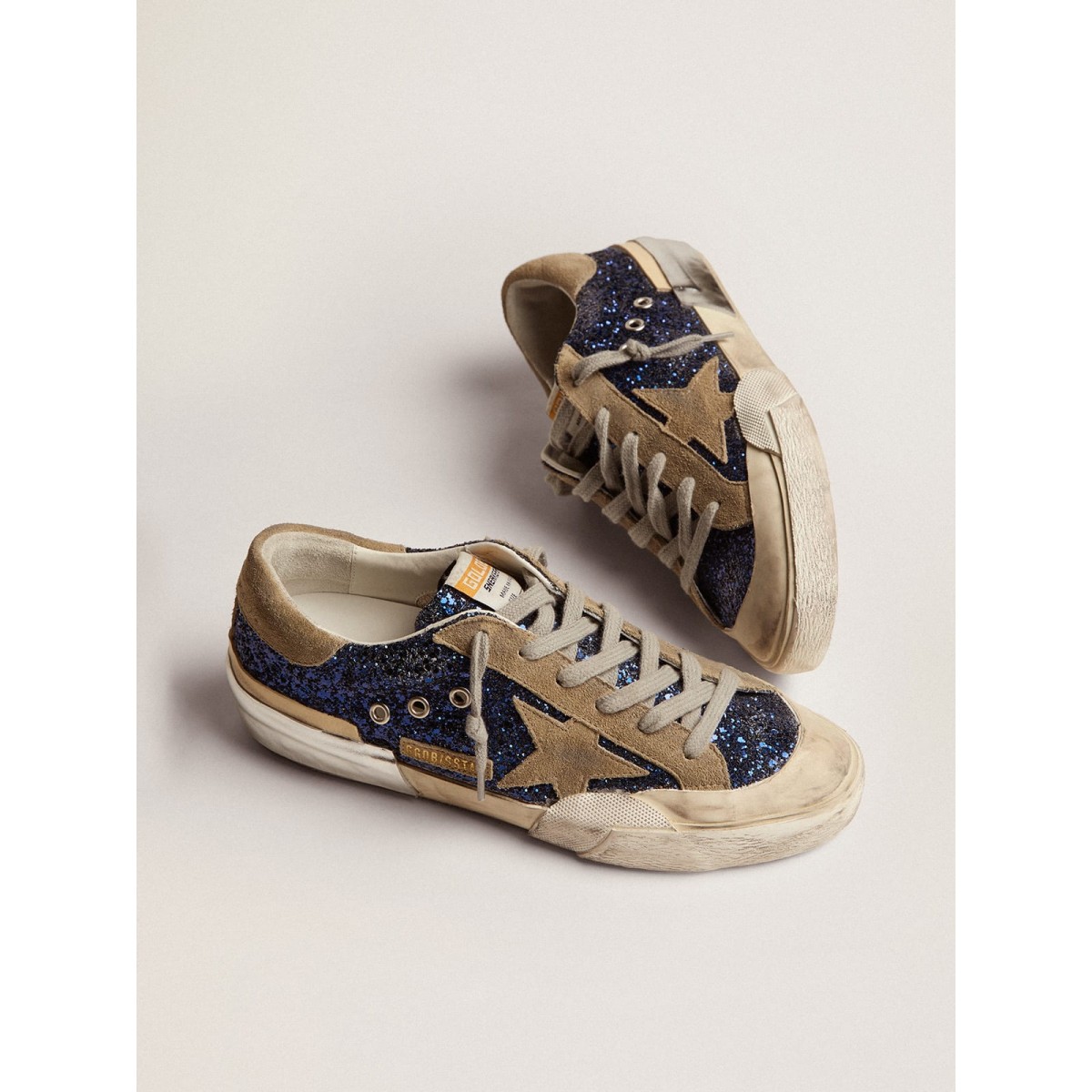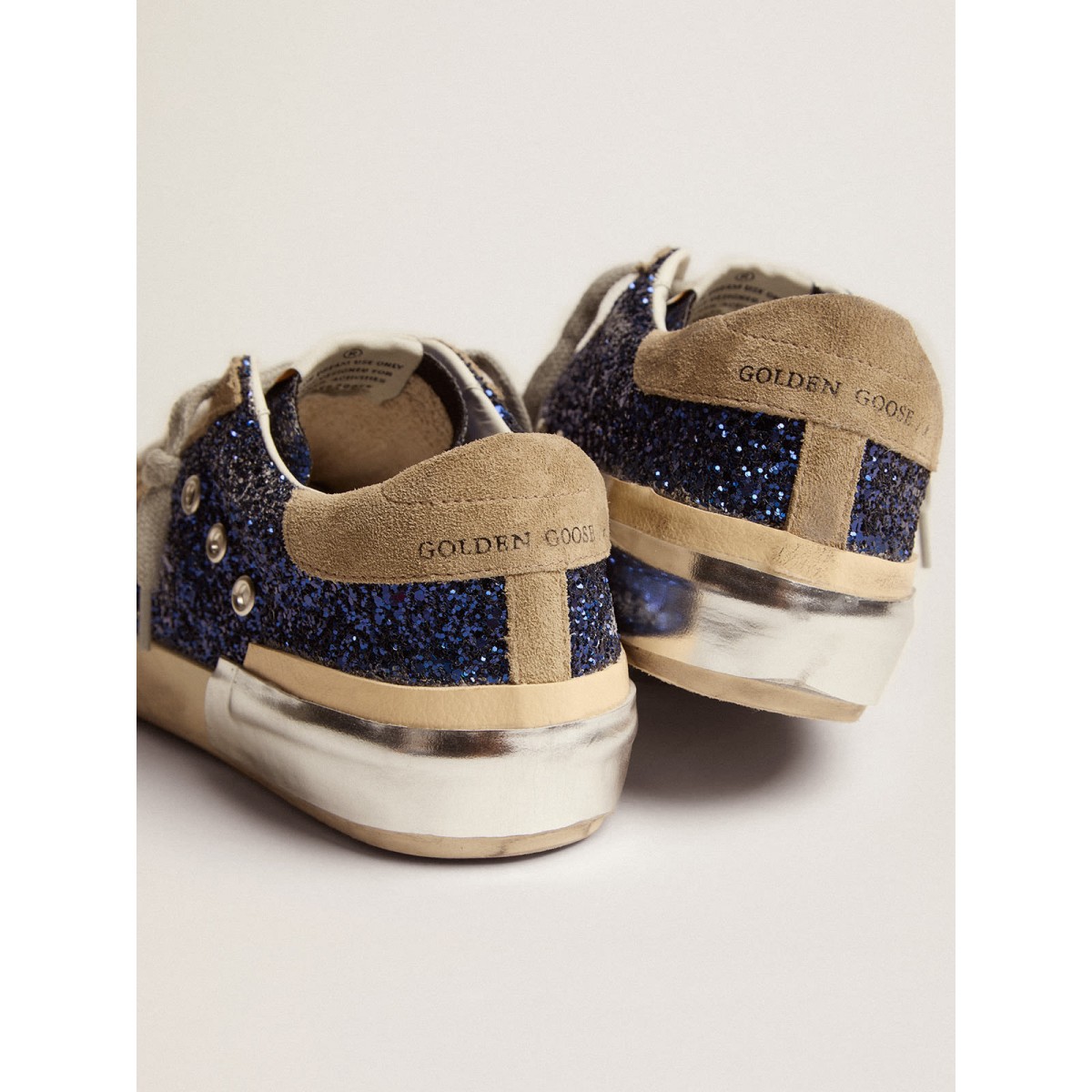 Eine zeitlose Ikone, die sich doch ständig weiterentwickelt. Bei Golden lieben wir es, unsere Klassiker zu nehmen und sie ständig zu überarbeiten, immer aus einem neuen Blickwinkel. Diese Super-Stern-Turnschuhe enthalten unerwartete Details: Das blaue Glitzer-Obermaterial ist mit einem beige Wildlederstern, einer Fersenlasche und einem Beilagen verziert, während das Fuchs mehrfach ist. Dies ist eine komplexe handwerkliche Technik, die die Zugabe verschiedener Texturen und Fuchsschirme umfasst: in glattem Platin-farbiges Leder und beige gehämmertes Leder. .81593