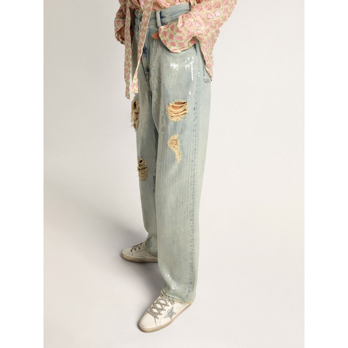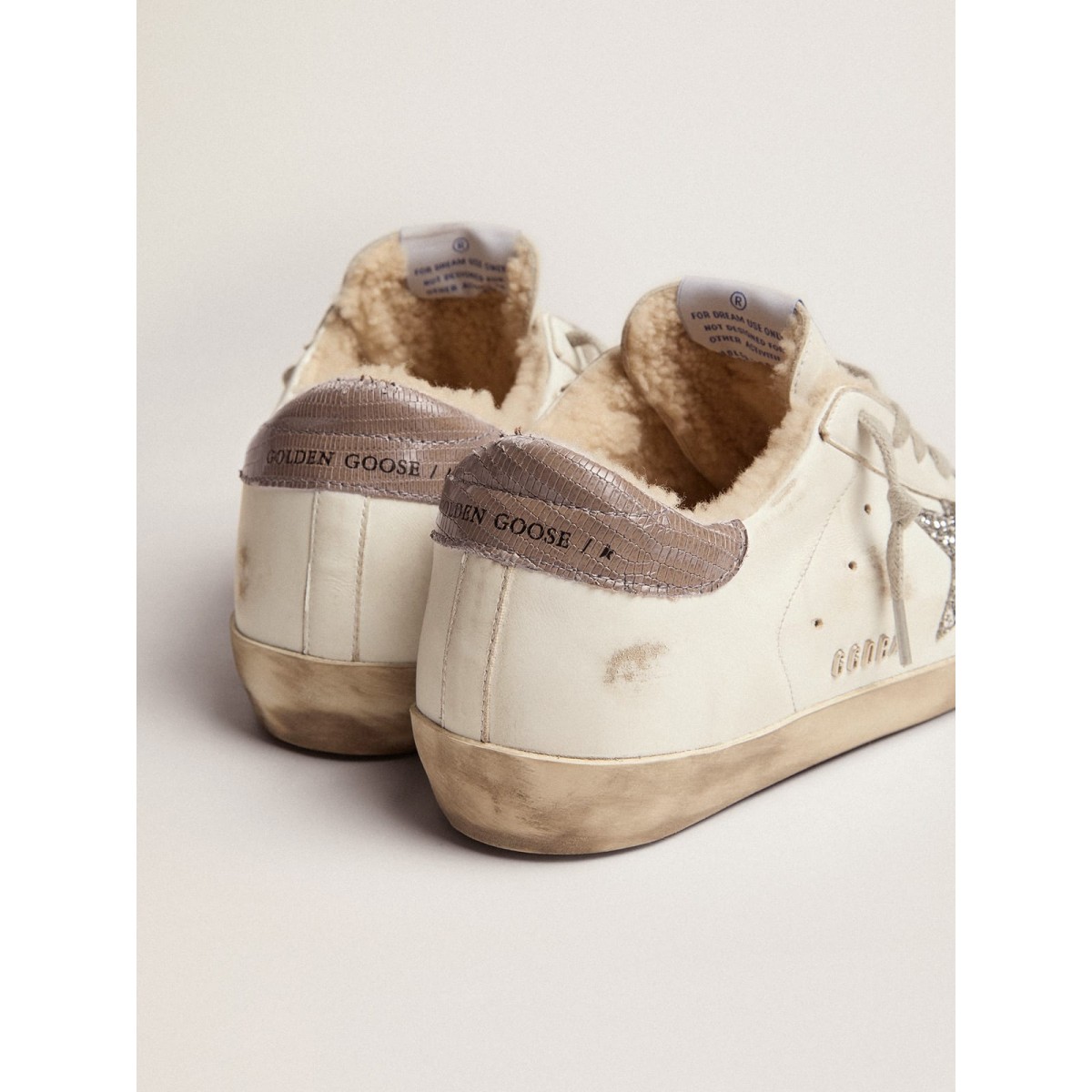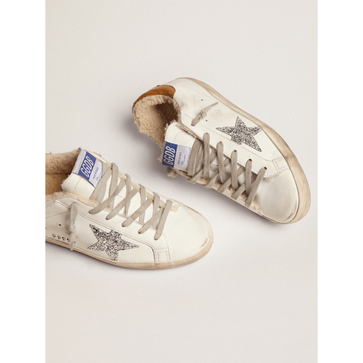 Eine zeitlose Ikone, die sich doch ständig weiterentwickelt. Bei Golden lieben wir es, unsere Klassiker zu nehmen und sie ständig zu überarbeiten, immer aus einem neuen Blickwinkel. Diese Super-Stern-Sneakers sind in weicher Schleife ausgekleidet und verfügen über ein weißes Leder-Obermaterial mit einem silbernen Glitzerstern und einem Tauben-Grau-Lederabsatz von Echsendruck. Das galvanische Silbermetall-GGDB-Schriftzeichen und die Eisgrauen-Schnürsenkel Fügen Sie den Finishing-Treffer hinzu.