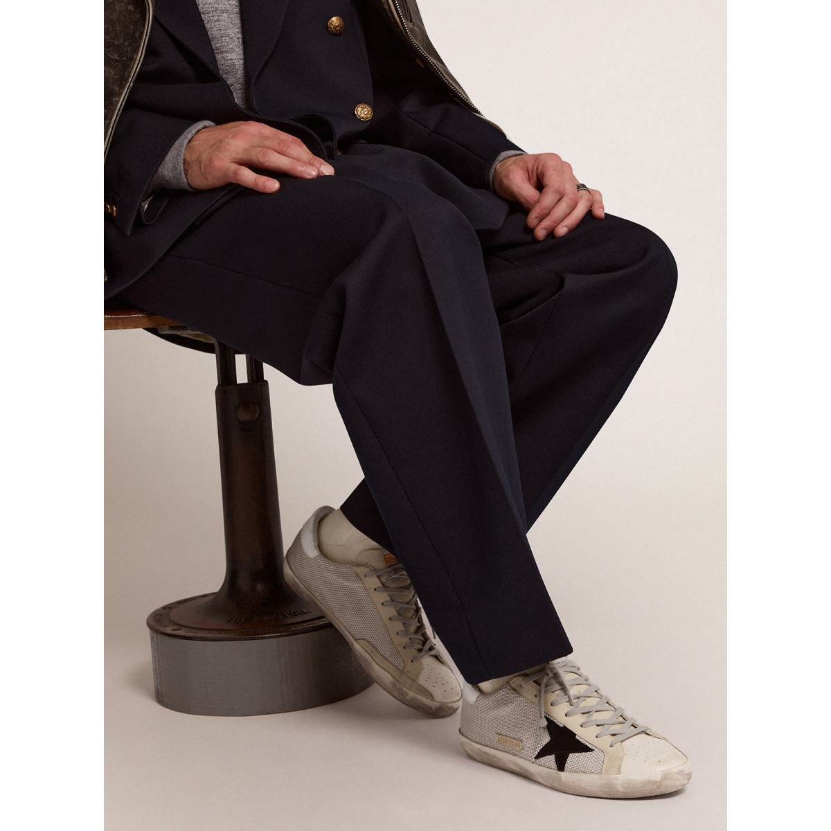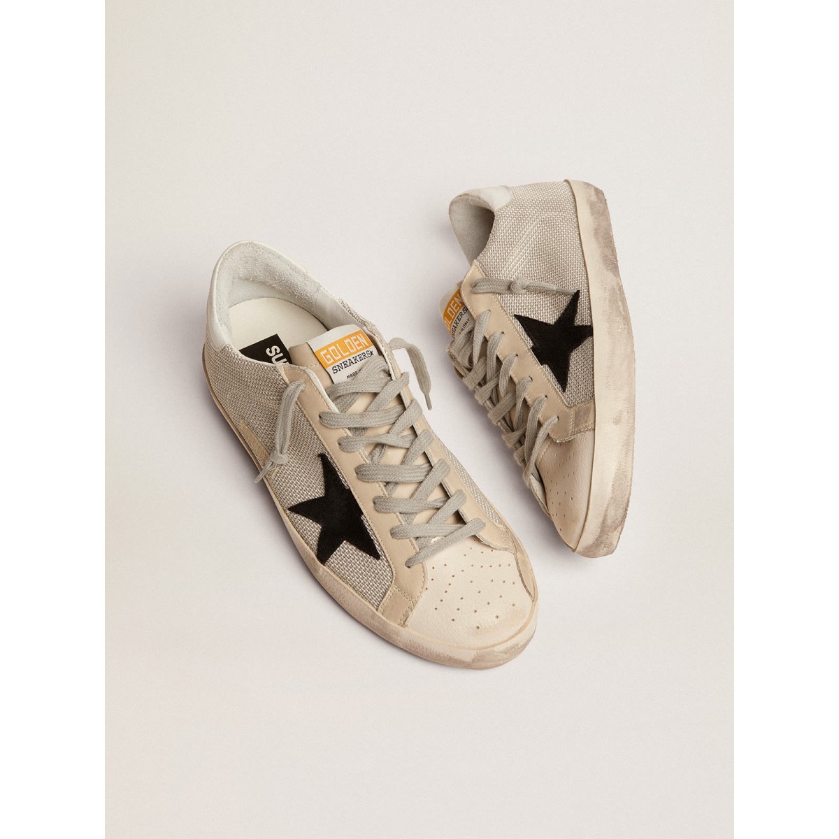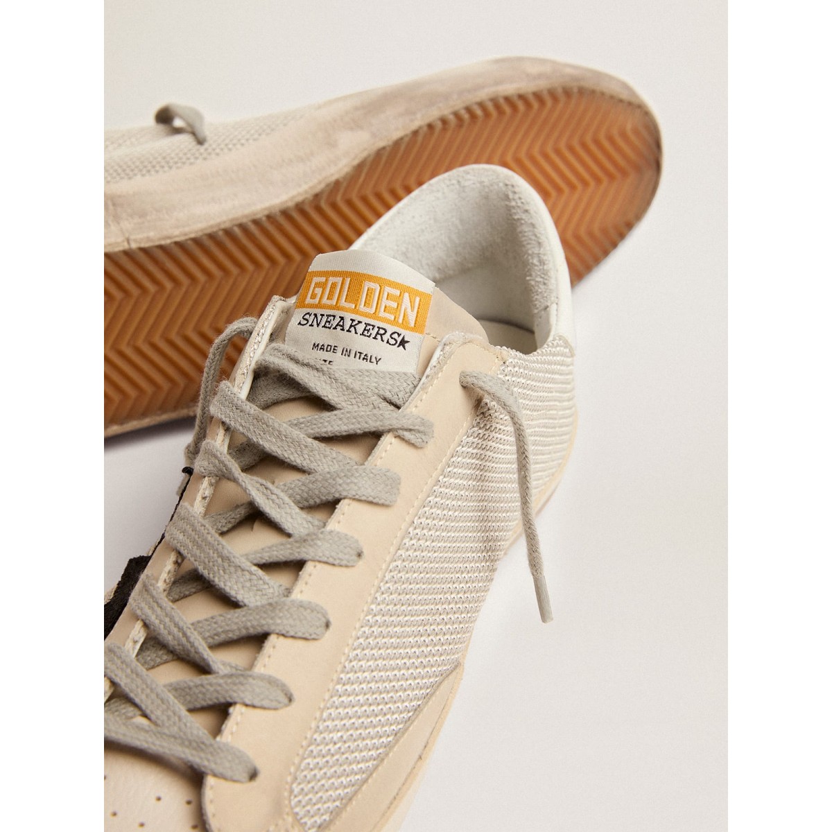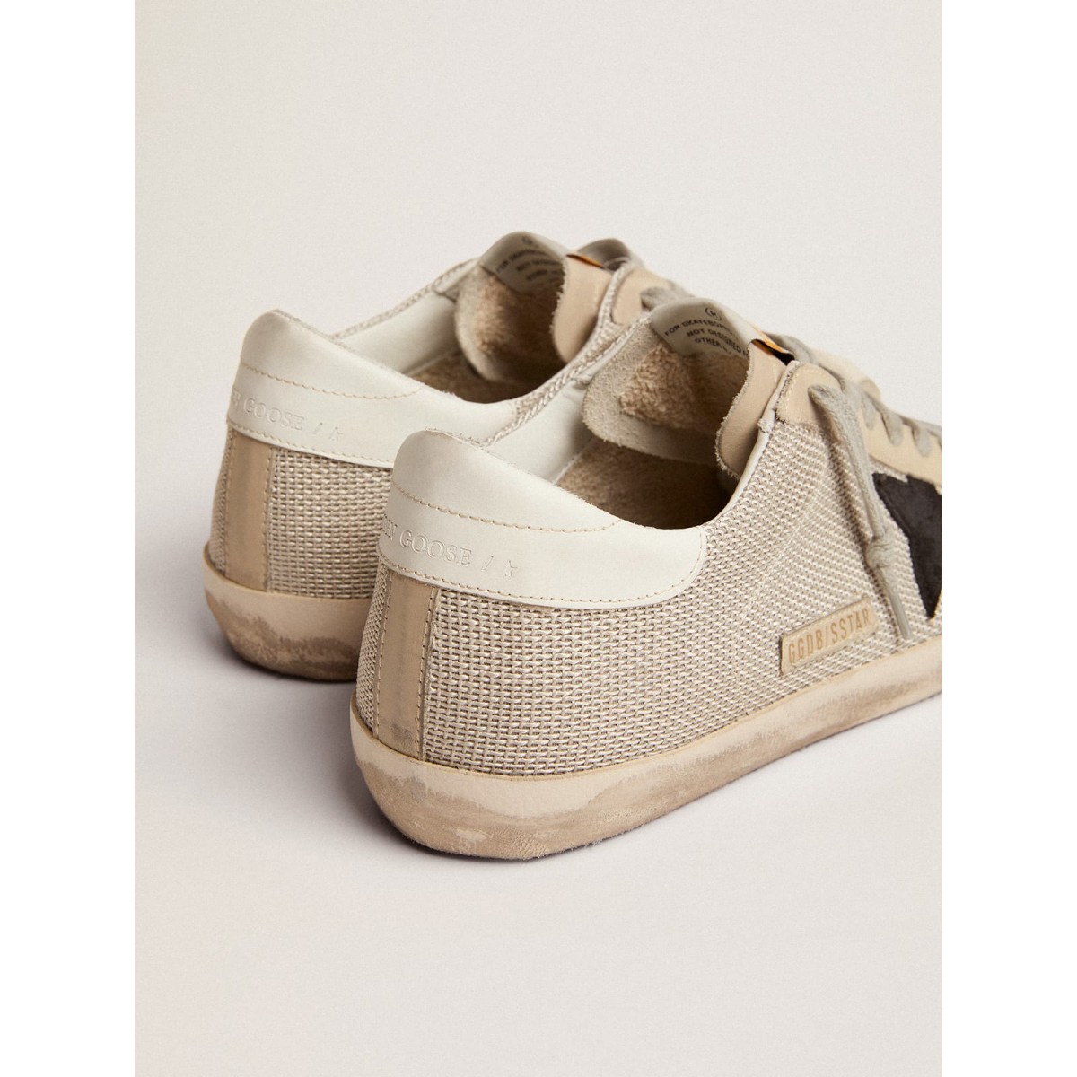 Die Zugabe von Elementen des aktiven Verschleißes definiert das Design der Super-Stern-Turnschuhe dieser Männer. Der legendäre Stil erhält eine neue Definition mit der Mischung aus Leder und Maschen, einem legendären goldenen Gansmaterial, Ösen auf der Zehenkappe und dem klassischen GGDB -Vintage -Finish. . Gummi