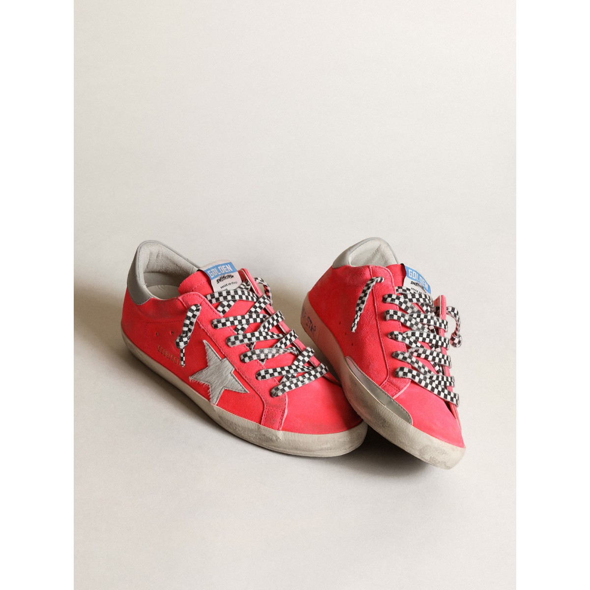Eine zeitlose Ikone, die sich doch ständig weiterentwickelt. Bei Golden lieben wir es, unsere Klassiker zu nehmen und sie ständig zu überarbeiten, immer aus einem neuen Blickwinkel. Dieses Modell mit einem fluoreszierenden Hummer-Farben-Wildleder-Obermaterial verfügt über einen weißen Pony-Hautstern und eine graue Lederferse-Tab. Die Schwarz-Weiß-Überprüfungsschnürsenkel Fügen Sie den Finishing Touch hinzu.>