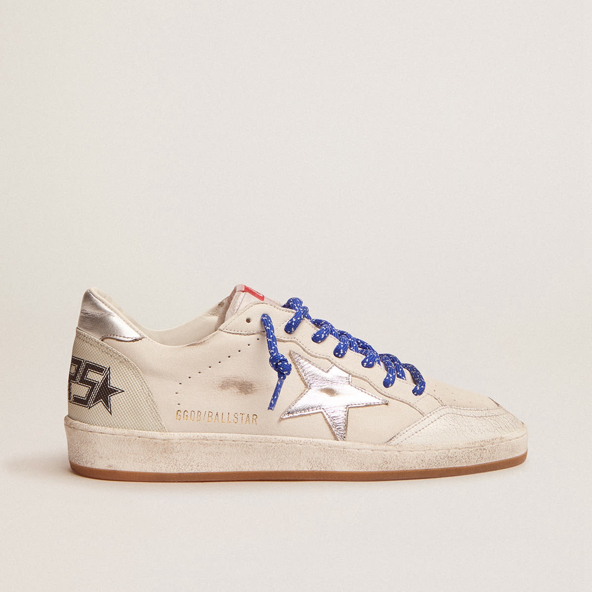 Golden Goose Ball Star Ltd Turnschuhe in weißem Nappa Leder mit silbernen Laminat Lederstern und Ferse Tab GMF00117.f002604.80185