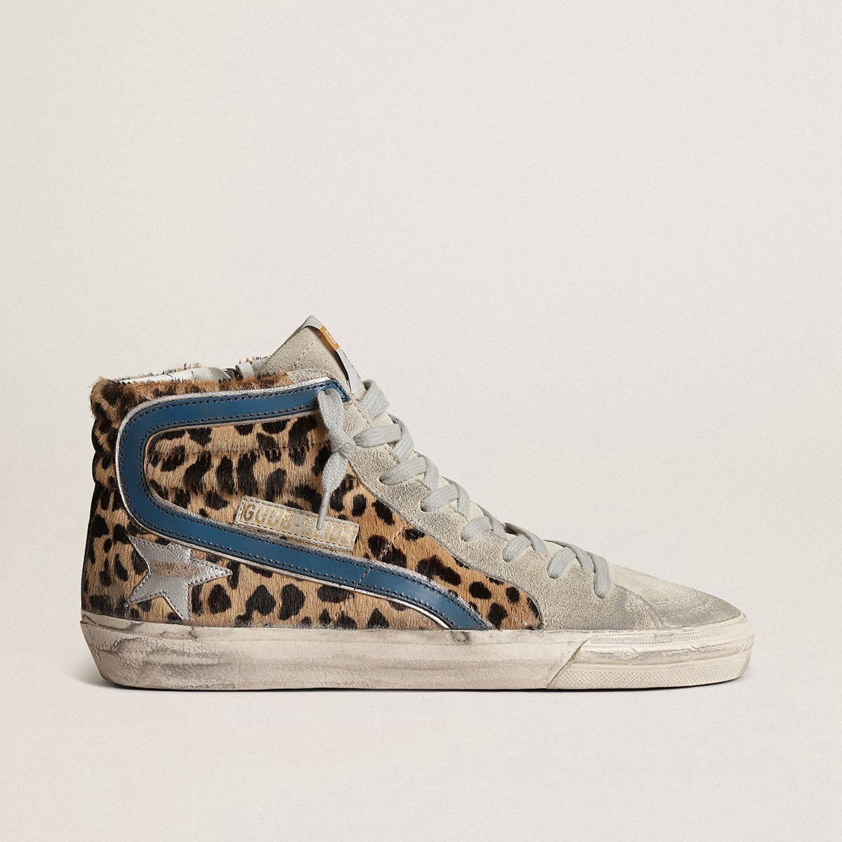 Golden Goose Slide Turnschuhe mit Leoparden-Druck-Pony-Hautstern und schwarzem Leder-Blitz GMF00115.f002659.10935