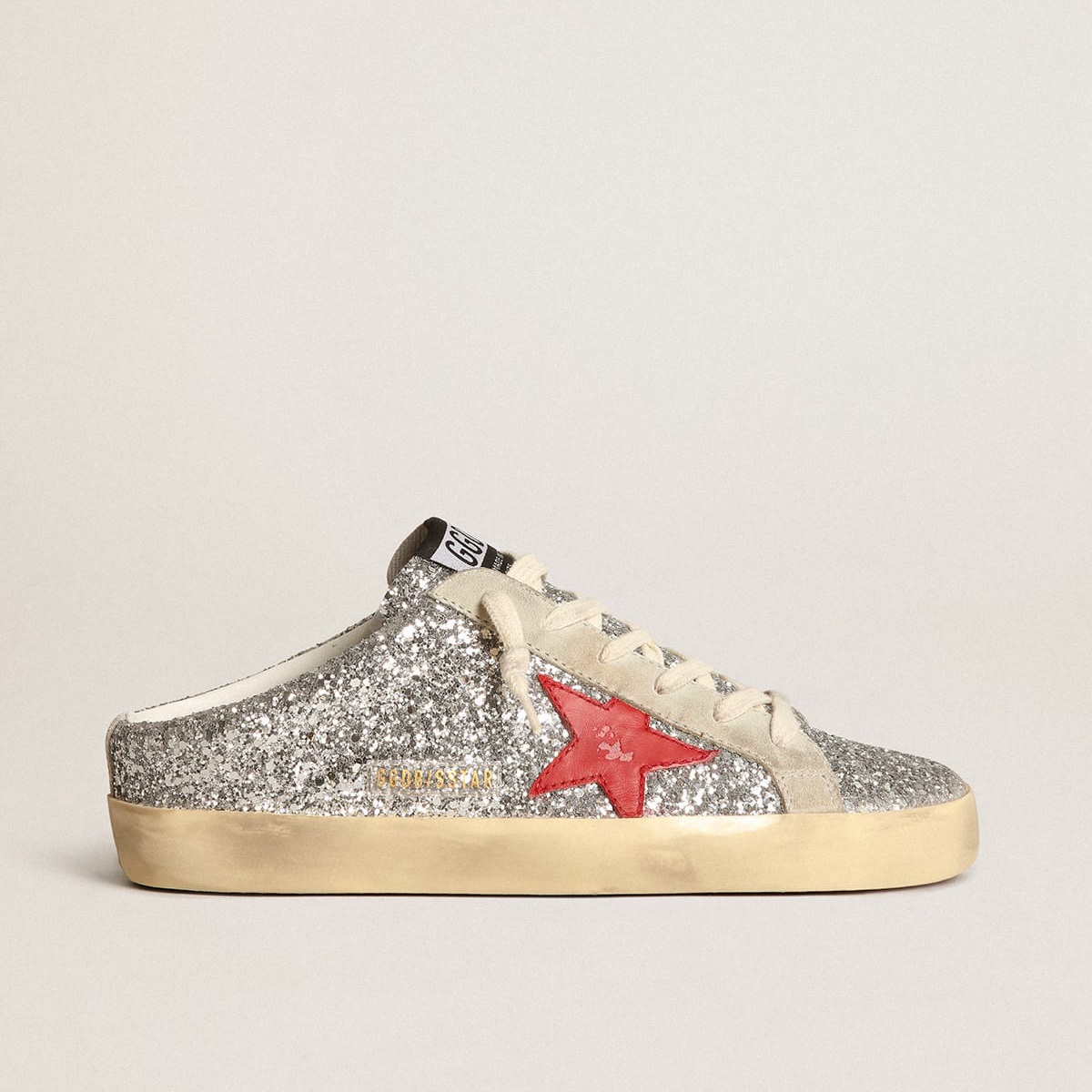 Super-Star-Sabots von Golden Goose im Silberglitter mit rotem Lederstar GWF00110.f003780.81521