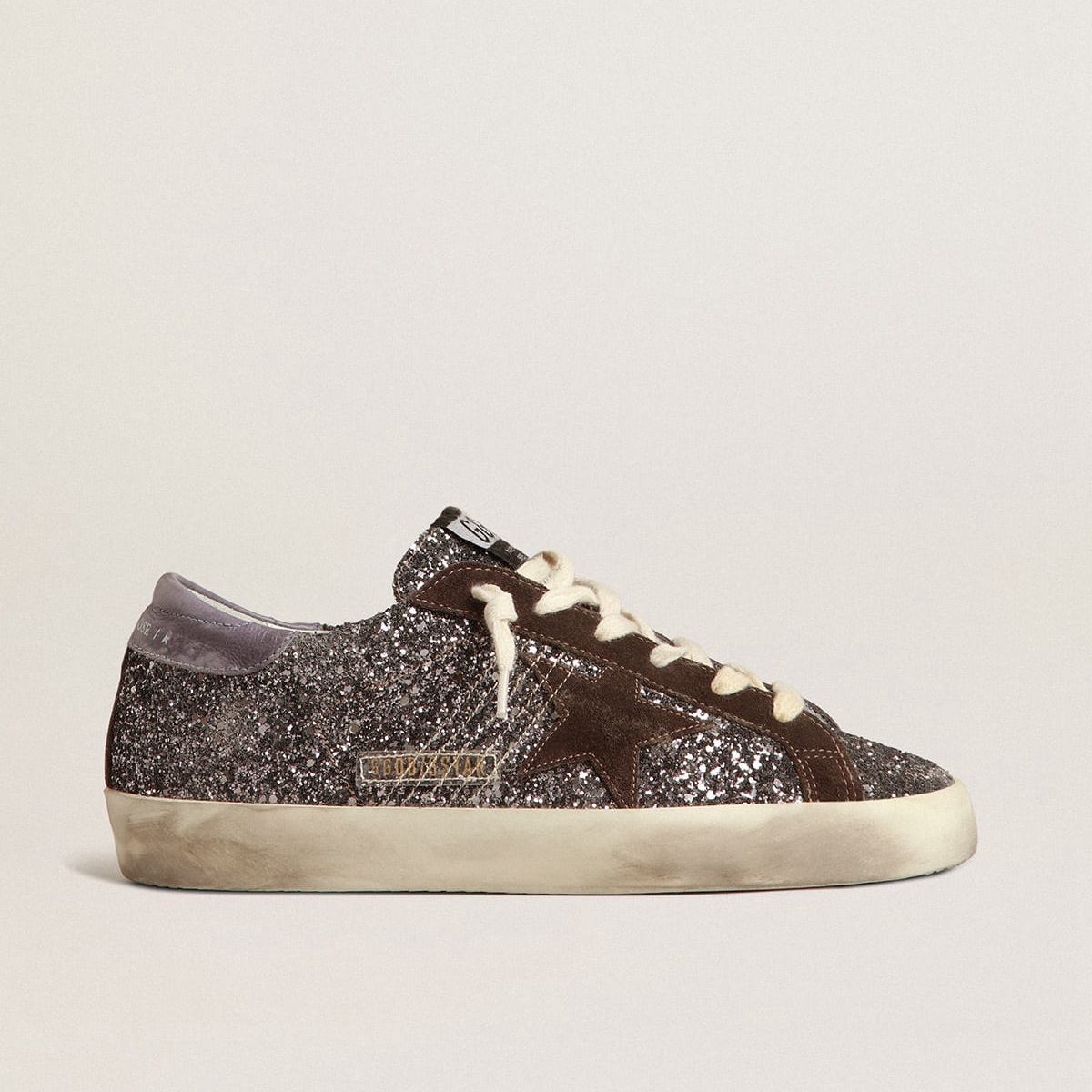 Golden Goose Super-Star im Glitzer mit einem braunen Stern und einer lila Ferse Tab GWF00101.f003986.60394