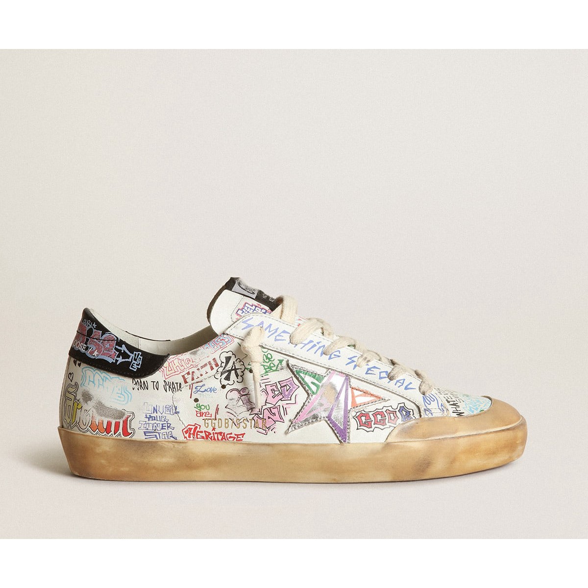 Golden Goose Super-Star Turnschuhe Penstar in weißer Leder- und Multicolor-Schriftzug GWF00107.f003475.81833